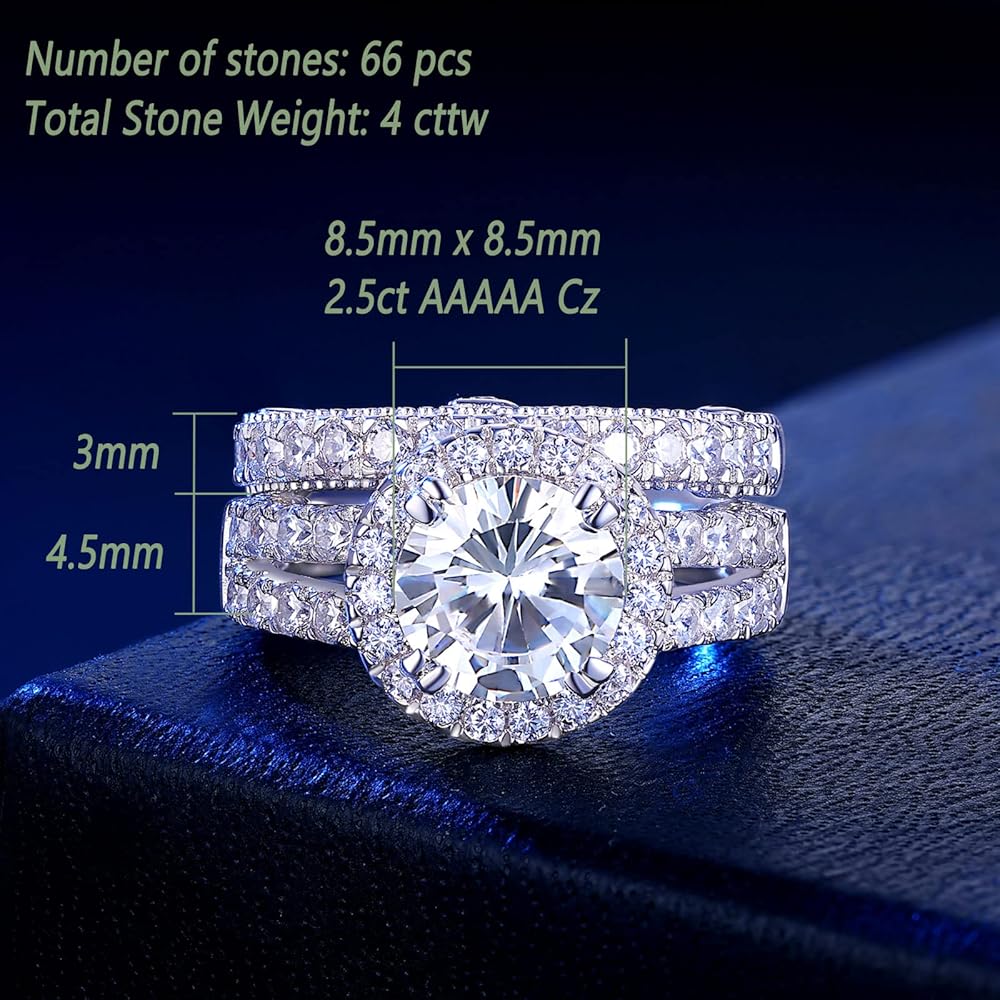 Wuziwen 4Ct جولة قطع خواتم الزفاف خاتم الخطوبة مجموعة للنساء زركونيا مكعب 925 الفضة الاسترليني مع 3.5mm العصابات الخلود للنساء خمر الفضة الاسترليني تشيكوسلوفاكيا تكويم حلقة تعزيز SZ 7