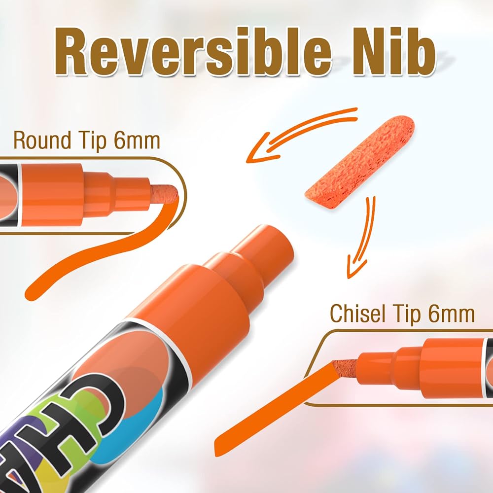 ❤نطاق واسع من الاستخدامات: تتميز أقلام سبورة الطباشير برأس رصاصي قابل للتحويل وطرف إزميل 6 مم، مما يجعل خطوطًا جريئة غير شفافة وخطوط حادة، سهلة القراءة، لا تنقط أو تتسرب، لا فوضى بعد الآن! يمكنك استخدام أقلام الطباشير الملونة هذه لطلاء زخارف عيد الميلاد، وتزيين النوافذ/الأبواب/السيارات للتخرج، والكتابة على السبورة المغناطيسية لقائمة أسبوعية في المطبخ، ولافتة أول/آخر يوم من المدرسة، ولافتة سبورة العودة إلى المدرسة، وقائمة فريدة من نوعها بنفسك. اللوحات ولافتات الاحتجاج ورسم المشاريع الفنية على الصخور وما إلى ذلك.