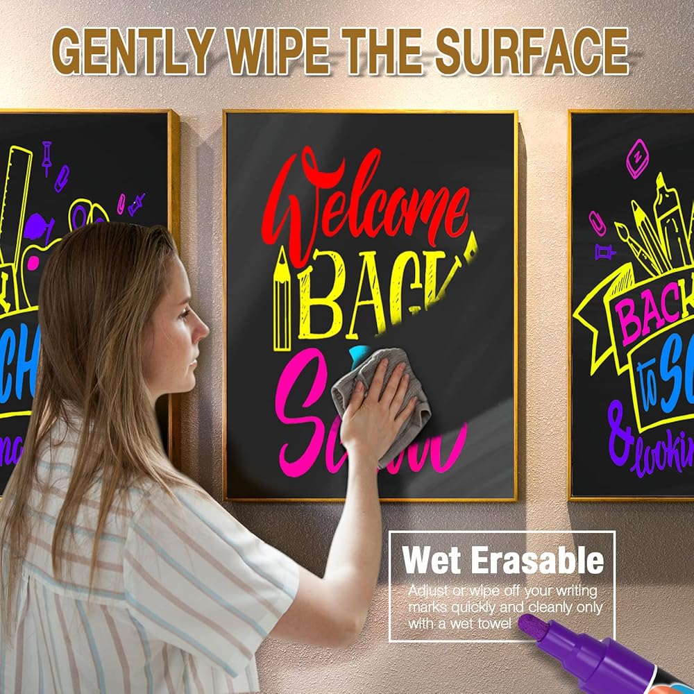 ❤12 لون نيون ساطع: مجموعة أقلام الطباشير لدينا مكونة من 12 لونًا حيويًا متنوعًا، بما في ذلك الأبيض والأسود والأحمر والأزرق والأخضر والبني والأرجواني والأصفر والبرتقالي والوردي والذهبي المعدني والفضي، مما يمنحك المزيد من الألوان اختيار. الألوان المقروءة واضحة للغاية على مسافة طويلة ولا تبهت عندما تجف، مثالية للاستخدام على سبورة الفصل الدراسي، ولوحة القائمة السوداء الجافة الممحاة، واللافتة، وتقويم اللوحة السوداء، والباب الزجاجي/اللوحة، والمرآة، ولوحة LED، والسبورة المغناطيسية، علامة العودة إلى المدرسة وما إلى ذلك