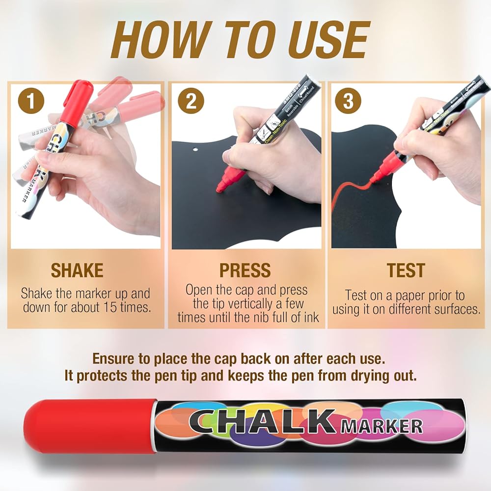 ❤غير سامة وآمنة للأطفال: أقلام الطباشير المبللة القابلة للمسح هذه عبارة عن حبر مائي وغير سام وآمن للأطفال. لا تنكسر علامات السبورة إلى النصف إذا ضغطت بقوة شديدة وبدون صوت الطباشير الصرير. أقلام طلاء الطباشير تتدفق بالتساوي وسريعة الجفاف، لا مزيد من الفوضى! حان الوقت لاستبدال الطباشير القديم المترب الآن! ستقع في حب هذه الأقلام ذات التغطية القوية وأقلام الطباشير السائل الخالية من الغبار.