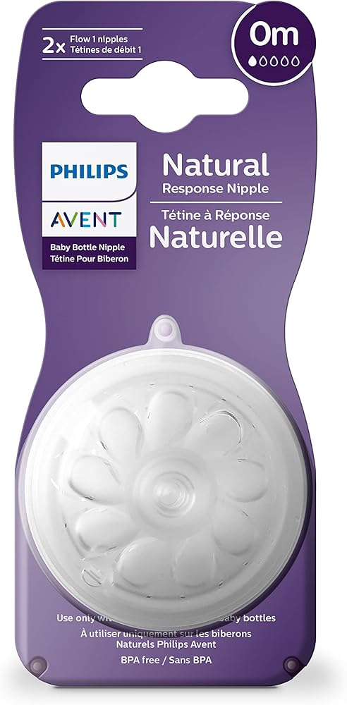 Philips Avent Natural Response nipple lets baby control the pace of the milk, like they do when breastfeeding. The nipples' unique opening and tip only releases milk when your baby actively drinks. When pausing to swallow and breathe no milk flows. Baby can drink, swallow, and breathe using their natural rhythm, just like they do when breastfeeding. Easily combine breast and bottle feeding with a wide breast-shaped nipple with a soft feel that mimics the shape and feel of a breast; plus baby controlling the flow of milk. The nipple has a no-drip design which helps prevent lost milk from the tip. An anti-colic valve integrated into the nipple is designed to reduce colic and discomfort by sending air away from your baby's tummy. The Natural response nipples come in flow rates 1-5, to keep up with your baby's growth. Use Philips Avent Natural bottles only with Philips Avent Natural nipples. Includes: 2 Natural Response nipples, flow 1.