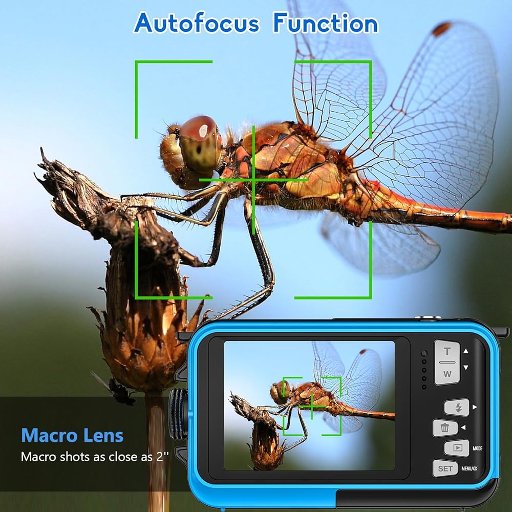 • ♥ Autofocus Function:Equipped with full autofocus functionality, this waterproof camera excels in macro photography while in photo mode, boasting an impressive closest shooting distance of up to 5cm (2''). With its 16x digital zoom feature, it effortlessly captures intricate details of subjects both nearby and distant and ensure a more exhilarating shooting encounter.