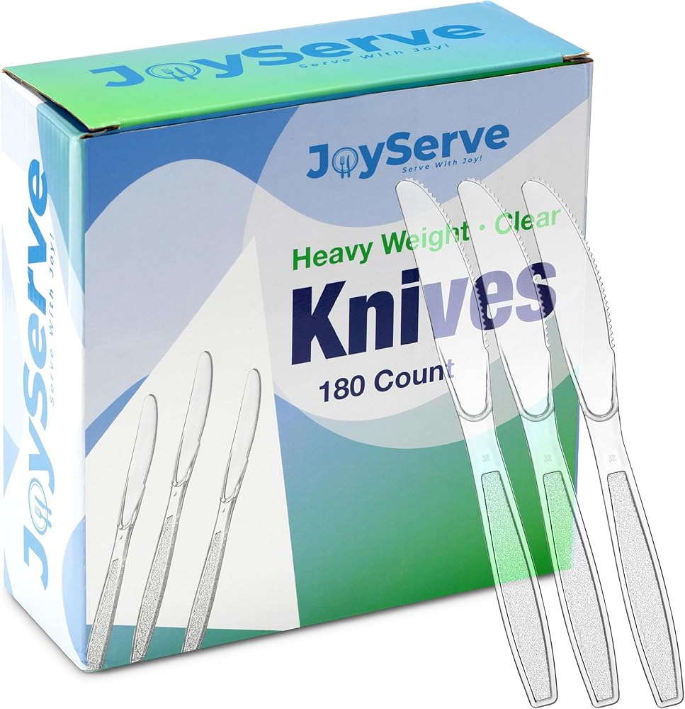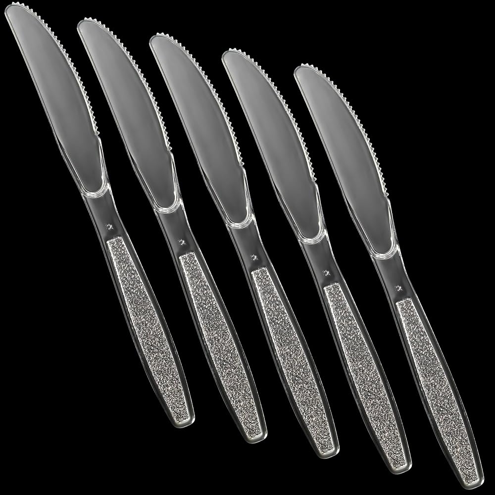 سكاكين بلاستيكية شفافة - (عبوة كبيرة 180) أواني بلاستيكية للاستعمال مرة واحدة، سكاكين شديدة التحمل، مجموعات أدوات مائدة فضية لمستلزمات الحفلات، العشاء، البوفيهات، الوجبات الخارجية، تقديم الطعام، خدمات الطعام