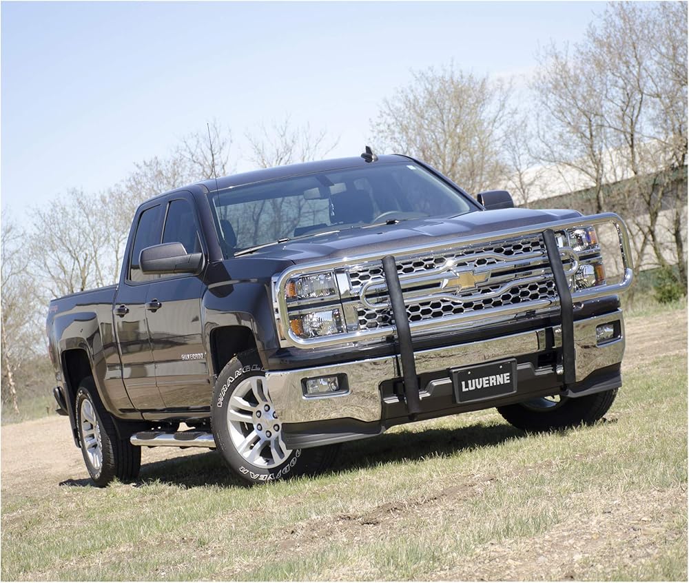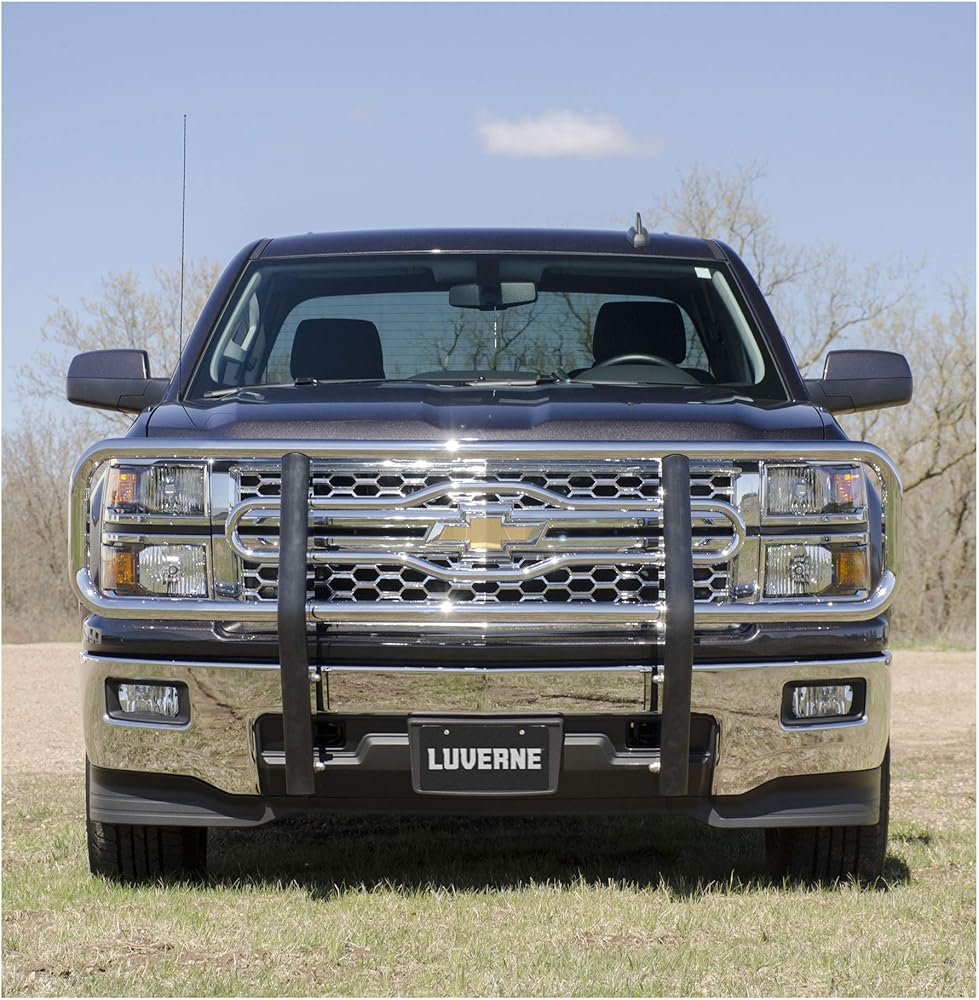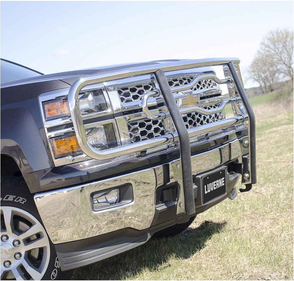 Adding accessories to your truck is all about highlighting and showing off its existing features, and no front-end accessory shows off these features quite like a LUVERNE grille guard. Our 2" tubular grille guard features our signature logo reveal and a vehicle-specific fit -- all to maximize front-end protection and truly make it all about your truck. It starts with our classic center section. The horizontal tubes are contoured to create our signature logo reveal, showing off your vehicle's badge with pride. The tubes also add extra protection for your vehicle's grille. To add some beef to the front end of your vehicle, the LUVERNE 2" brush guard is built tough. It is constructed from high-strength steel, assembled right here in the USA, to ensure the utmost quality. The frame-mounted uprights provide a solid structural base and are shielded with extruded rubber covers to better protect the finish. We also add a polished stainless steel backing to the uprights, giving them a clean, finished appearance that will outlast rust. Our 2" tubular grille guards are available in a durable textured black powder coat or a bright chrome-plated finish to suit the look of your own unique truck. To finish off the LUVERNE 2" steel brush guard and truly make it an accessory fit for your vehicle, we make each one vehicle-specific. This means no drilling necessary during the install and compatibility with your factory tow hooks on most models. This particular custom grille guard fits specific years of the Chevy Silverado 1500 and GMC Sierra 1500 (see application info to verify fitment). It mounts directly to the frame using strong steel brackets, and the brackets are covered in a black powder coat finish to ensure long-lasting durability. NOTE: Ring assembly and upright package included but shipped separately.