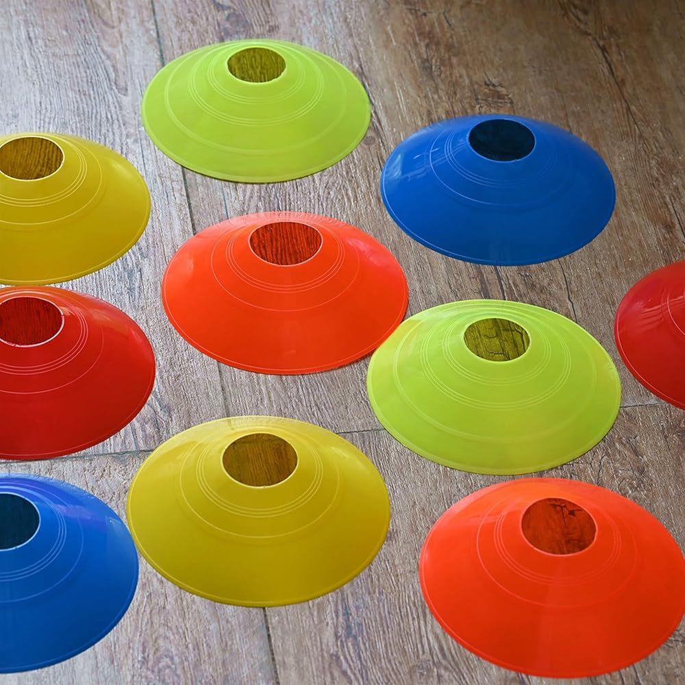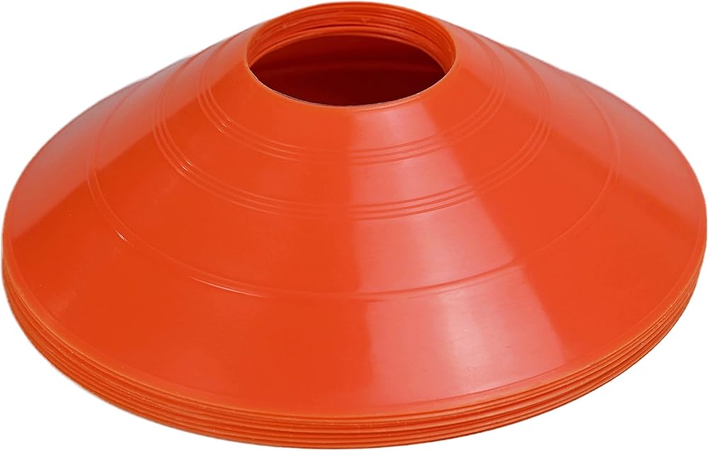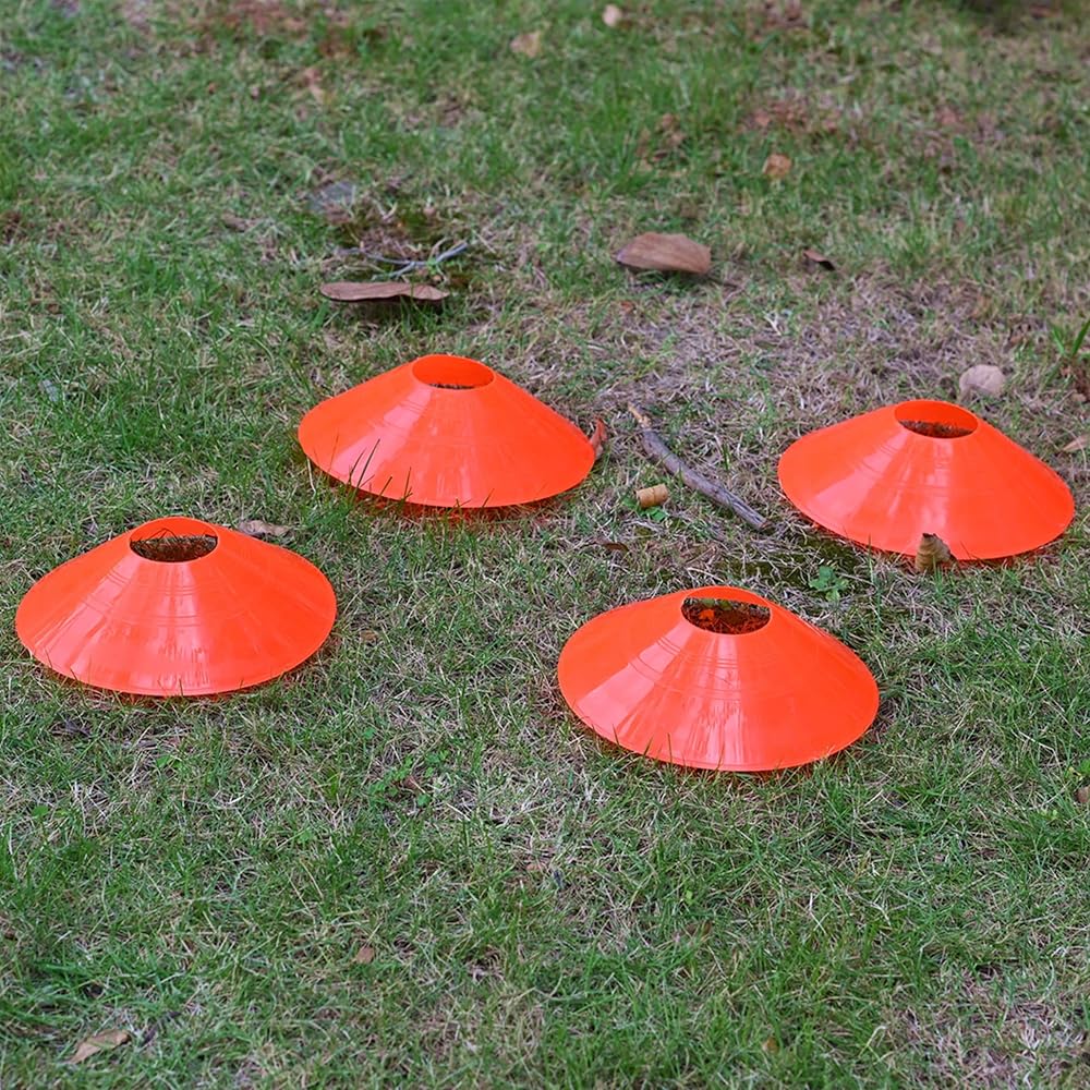 - Suitable for indoor and outdoor use, these impressive training cones are very sturdy and well-equipped to handle regular shocks from the ball and players. - A pack of 10 training cones is easy to store and carry, flexible and resilient. - Great choice for children's games, bicycle obstacle course, motorcycle training, racing, dog training, horse training, football, rugby, tennis, basketball, baseball, GAA sports, etc. - Orange Cones can be used for a variety of training activities such as sidelines, landmarks, speed and agility training, obstacles, and goals. - Add these cones to your fitness training equipment and speed training equipment package to ensure you get the exercises you need. - Don't miss our bright sports cones-they won't trip you. When you finish your day's work, stack them up and put them back in the bag for easy carrying and storage. - These soccer cones for drills improve your ability to quickly accelerate, decelerate, and change direction. Soccer Cones Measures: 1.9'' high, and has a diameter of 7.67'' (5*19.5cm), weight: 22grams/pc Package includes 10 x soccer disc cones, 1 x mesh bag.