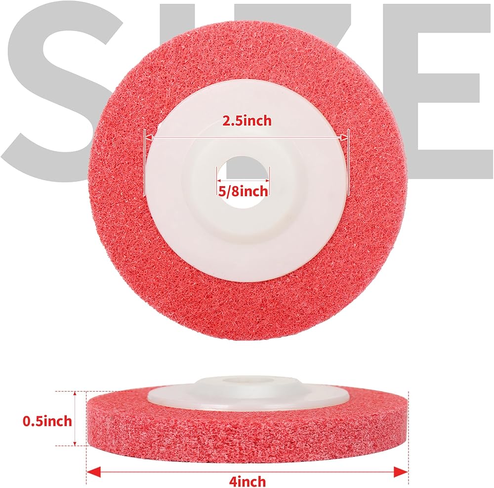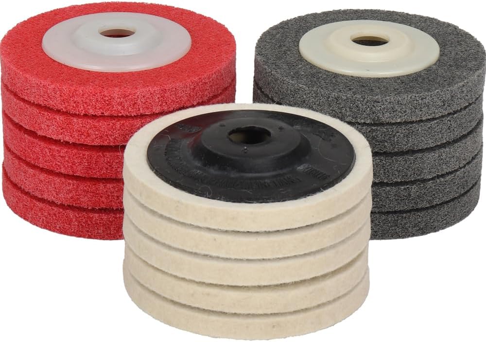 🌈【Package Included】: Wool Flat Wheel (Very fine level) x 5, Red Nylon Fiber Wheel (9P Hardess) x 5, Grey Nylon Fiber Wheel (7P Hardess) x 5, a total of 15 Pcs 4 Inch x 5/8 Arbor Wheel for Angle Grinder.