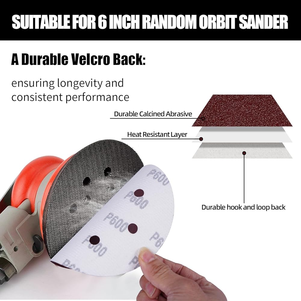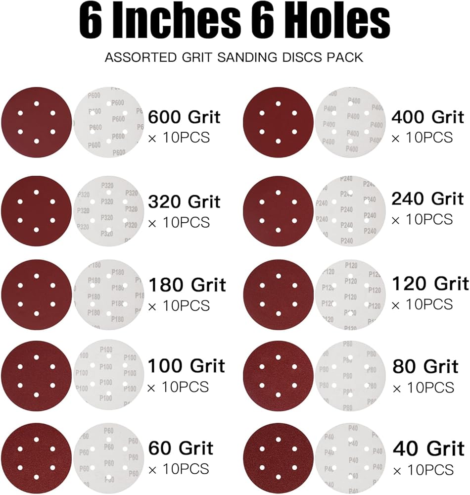 100 قطعة من أقراص الصنفرة مقاس 6 بوصة و6 فتحات بخطاف وحلقة، 40/60/80/100/120/180/240/320/400/600 قرص ورق الصنفرة لآلة الصنفرة المدارية