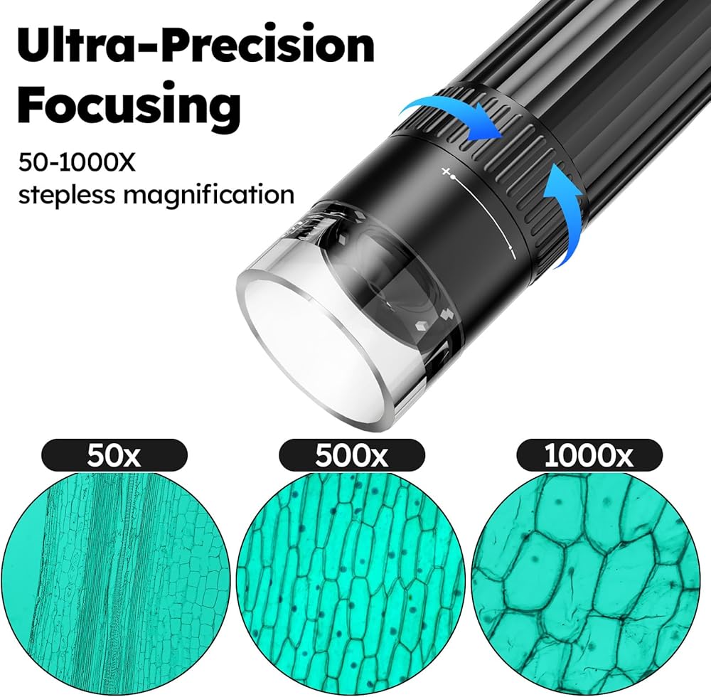 【تكبير ودقة عالية】مجهر واي فاي رقمي بتكبير عالي الدقة 50X-1000X، بدقة 1920x1080. يتميز بتصميم حامل على مرحلتين، حرية ضبط زاوية وارتفاع المجهر المحمول باليد. مجهزة بـ 8 مصابيح LED بثلاثة مستويات من السطوع وتفاصيل مراقبة مذهلة في عرض الإضاءة الكاملة.
