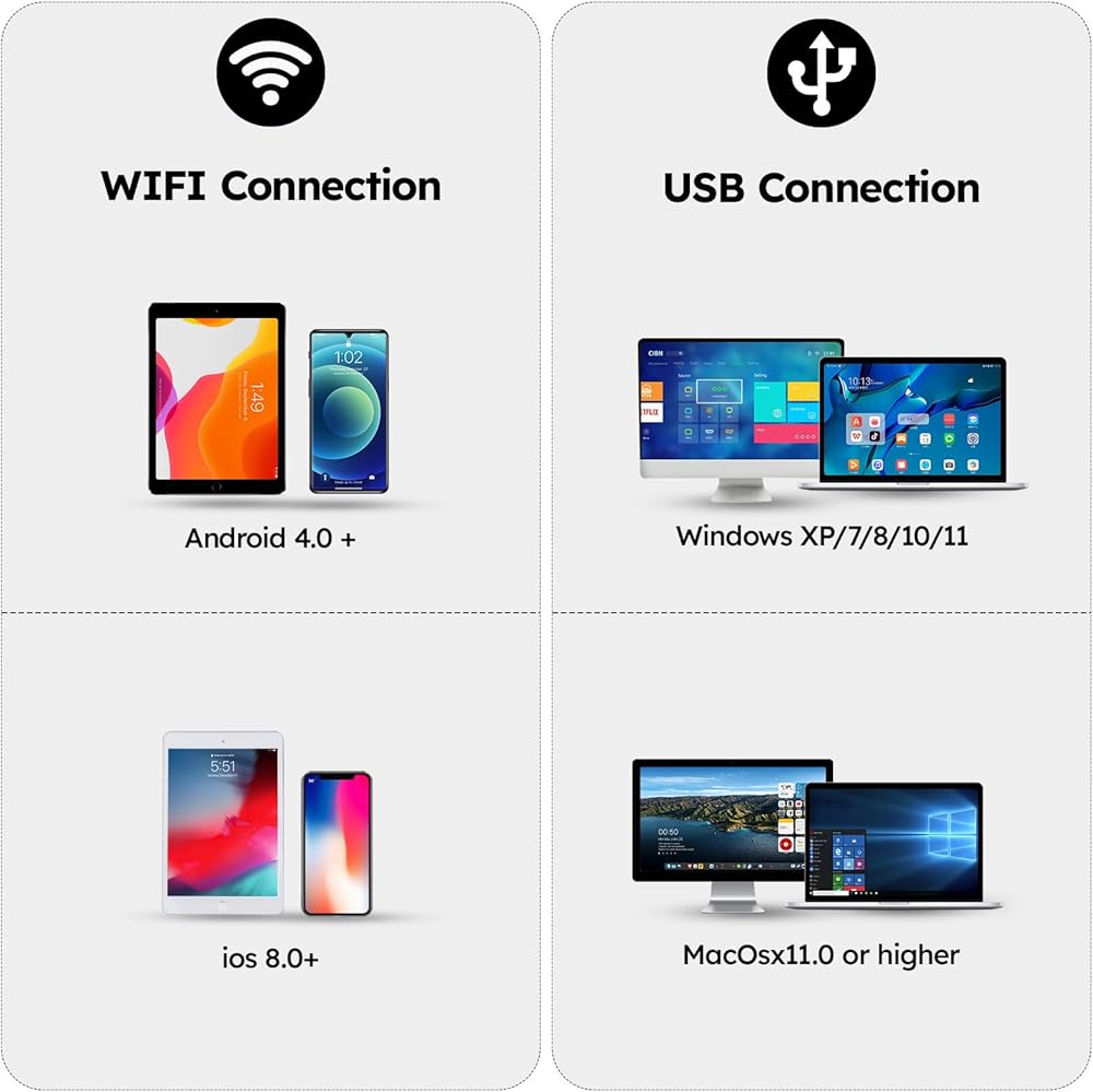 توافق رائع: يتضمن المجهر الرقمي اللاسلكي برنامجًا سهل الاستخدام، ويدعم Android 4.0+، iOS 8.0 أو أحدث، Windows XP/7/8/10/11، MacOSx 11.0 أو أحدث.