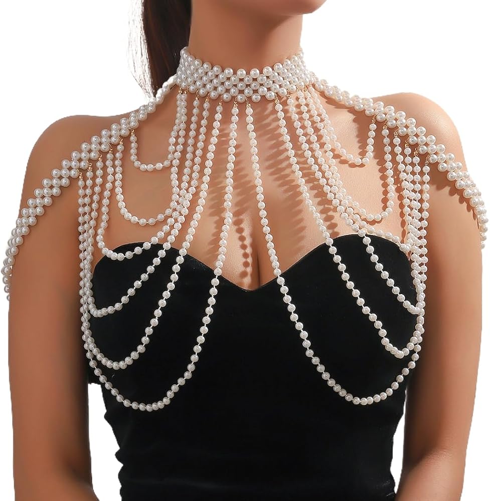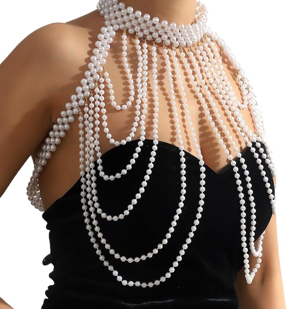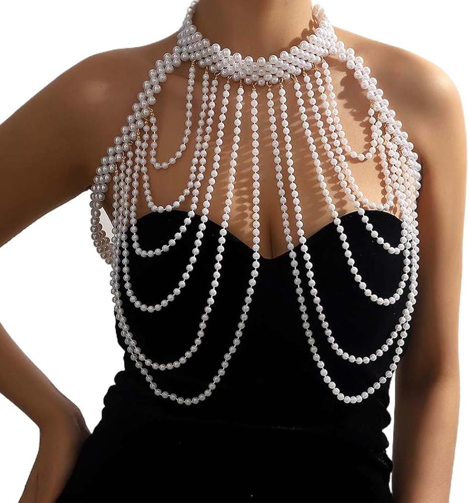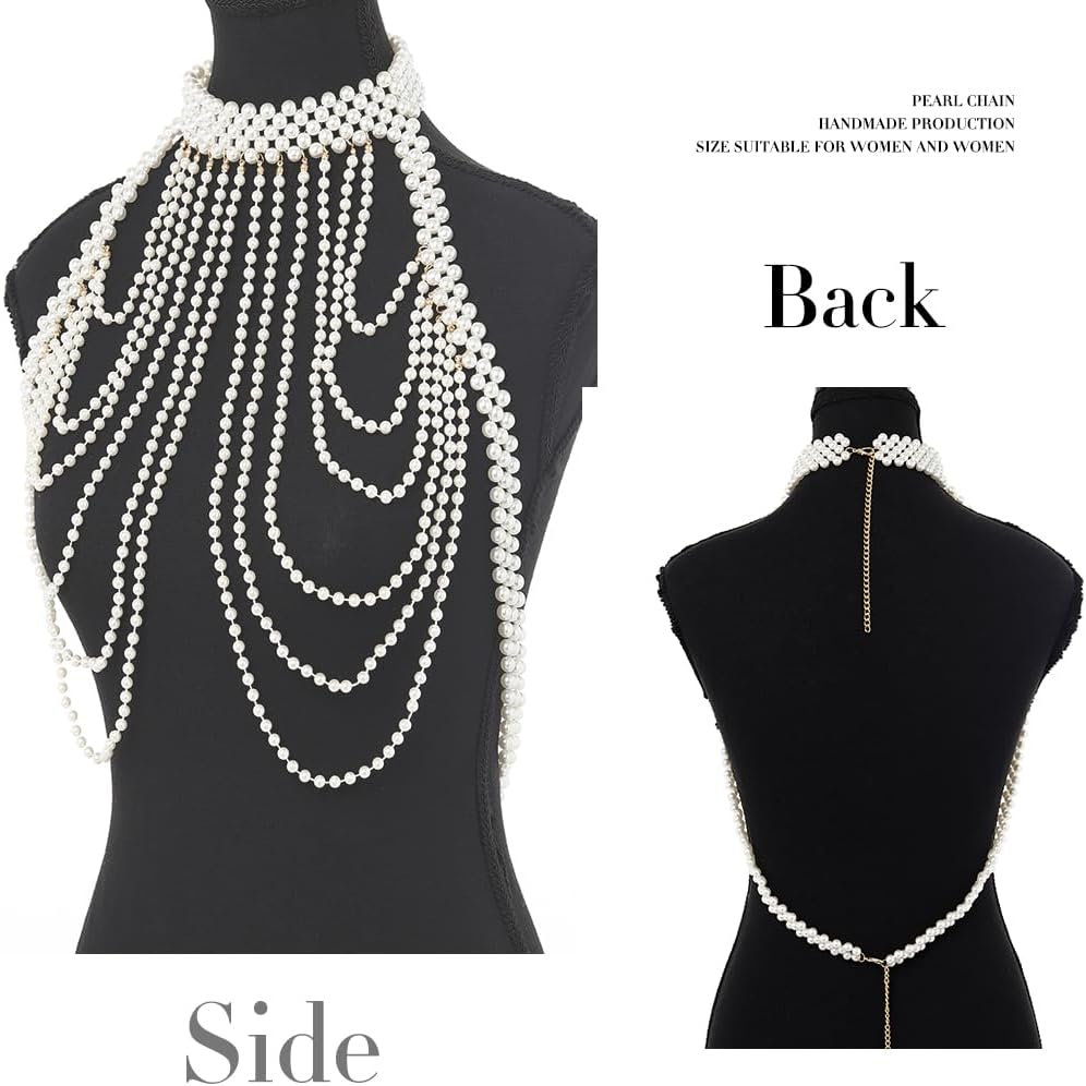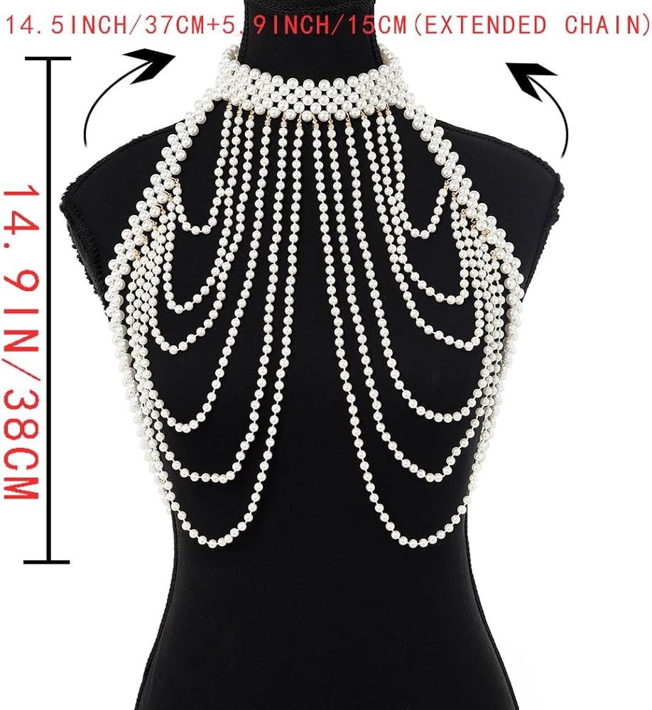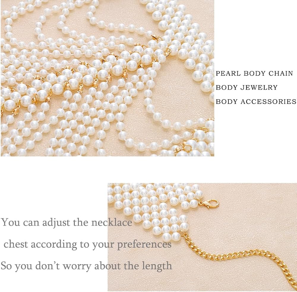 سلسلة جسم حمالة الصدر مصنوعة يدويًا من اللؤلؤ الأبيض، وحجمها يناسب النساء جيدًا، ويمكن تعديلها بشكل مناسب مع السلسلة الممتدة، يمكنك ضبط القلادة والصدر وفقًا لتفضيلاتك. لذلك لا تقلق بشأن الطول