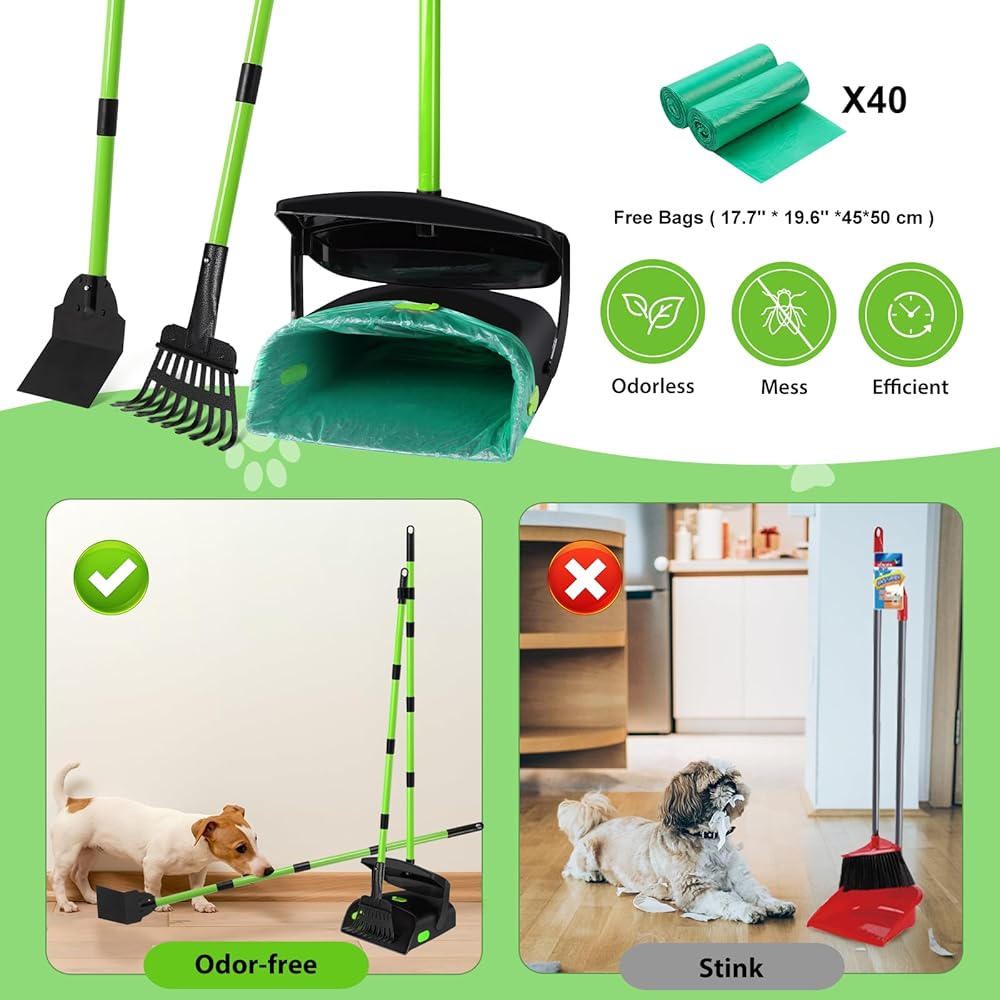 🐶𝗖𝗟𝗜𝗣 𝗧𝗢 𝗟𝗢𝗖𝗞 𝗕𝗔𝗚 - مجهزة بتصميم حقيبة سهل المشبك. يوجد مشبك للحقيبة في الجزء العلوي من مغرفة المخلفات لحمل الحقائب ذات الأحجام المختلفة وتأمينها. ونحن نقدم لك 40 قطعة من أكياس القمامة مقاس 17.7 × 19.6 بوصة في هذا المنتج، فأكياس البراز هذه أكثر سمكًا بمرتين من أكياس البقالة القياسية. لا تقلق بشأن الرائحة أو الكسر.