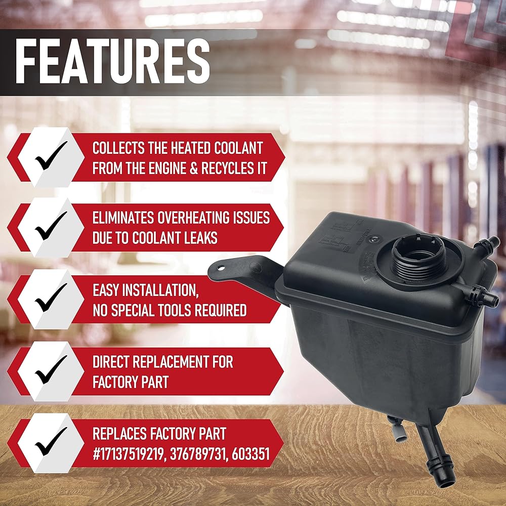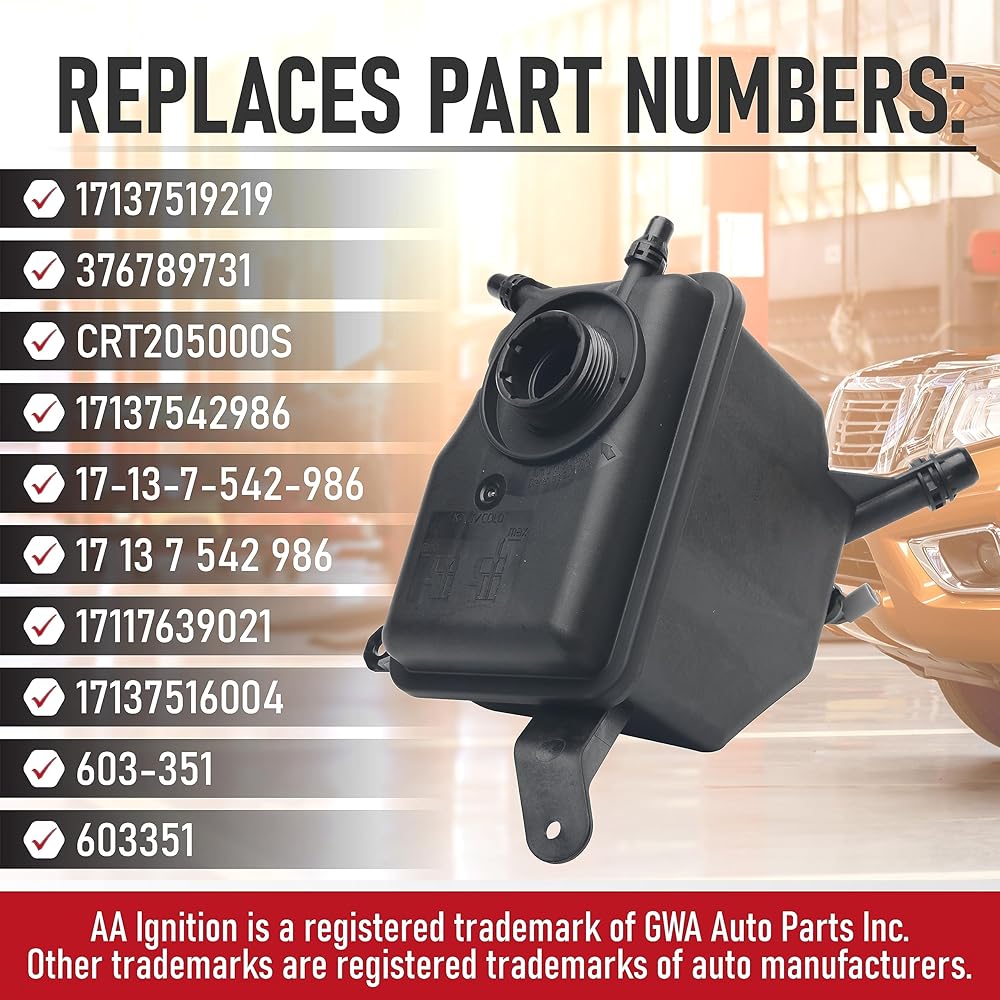 يستبدل الجزء رقم 17-13-7-519-219، 17 13 7 519 219، 17137519219، 376789731، CRT205000S، 17137542986، 17-13-7-542-986، 17 13 7 542 986، 171 17639021، 17137516004، 603-351 ، 603351 موجود بشكل شائع في المركبات الشهيرة 330i وX3 وX5 و38iC و325xi بما في ذلك الموديلات 04 و05 و06 و07 و08 و09 و10. يمكن وضع خزان توسيع فائض سائل تبريد الرادياتير بسهولة على حجرة المحرك المثبتة على المحرك قريب ومتصل بالرادياتير.