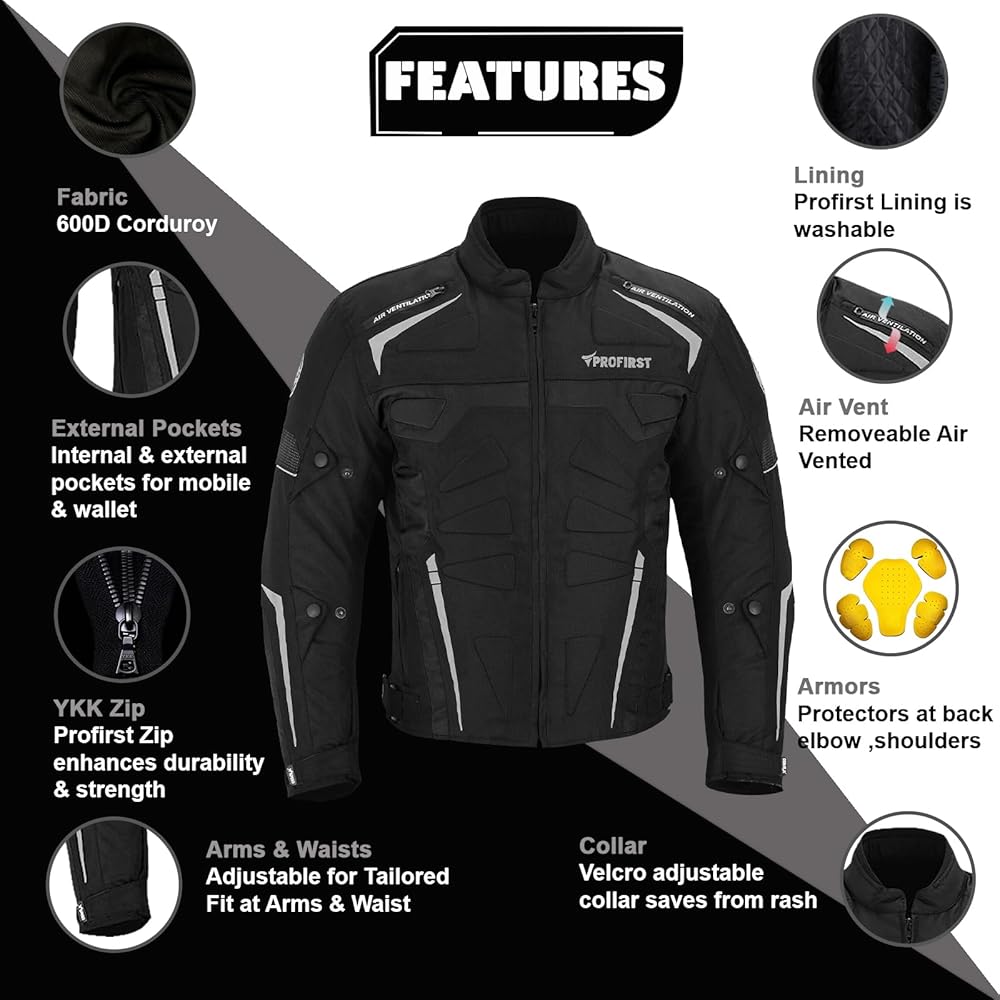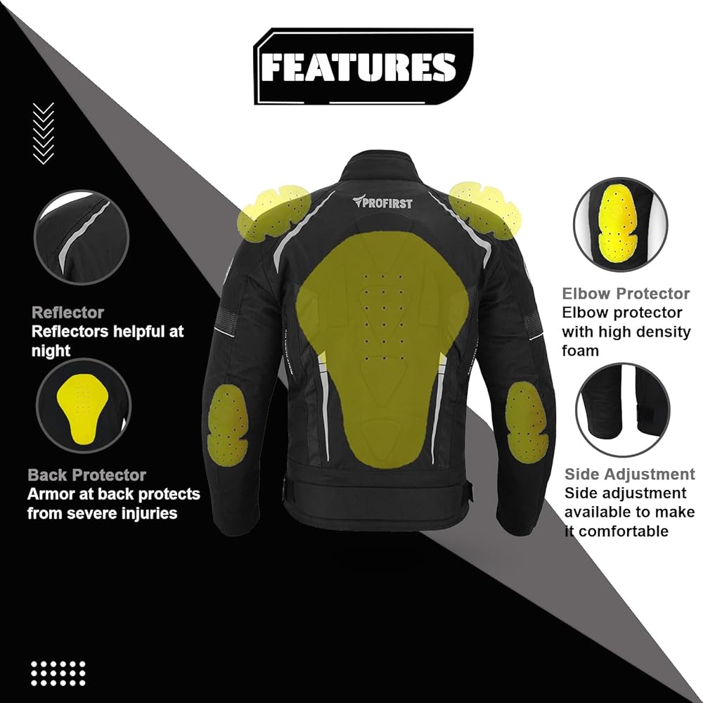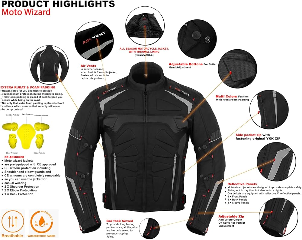 [Please Select Size First] 100% Waterproof ::: Special material inside to make jacket fully waterproof ::: CE Approved Removable Shoulder and Elbow Armours ::: Thick foam padding Protection at back ::: Extra Foam Padding at front and Back to provide maximum protection ::: Fastening: Zip ::: YKK Full Zip :::Cuff and waist adjustments with Fasteners strap