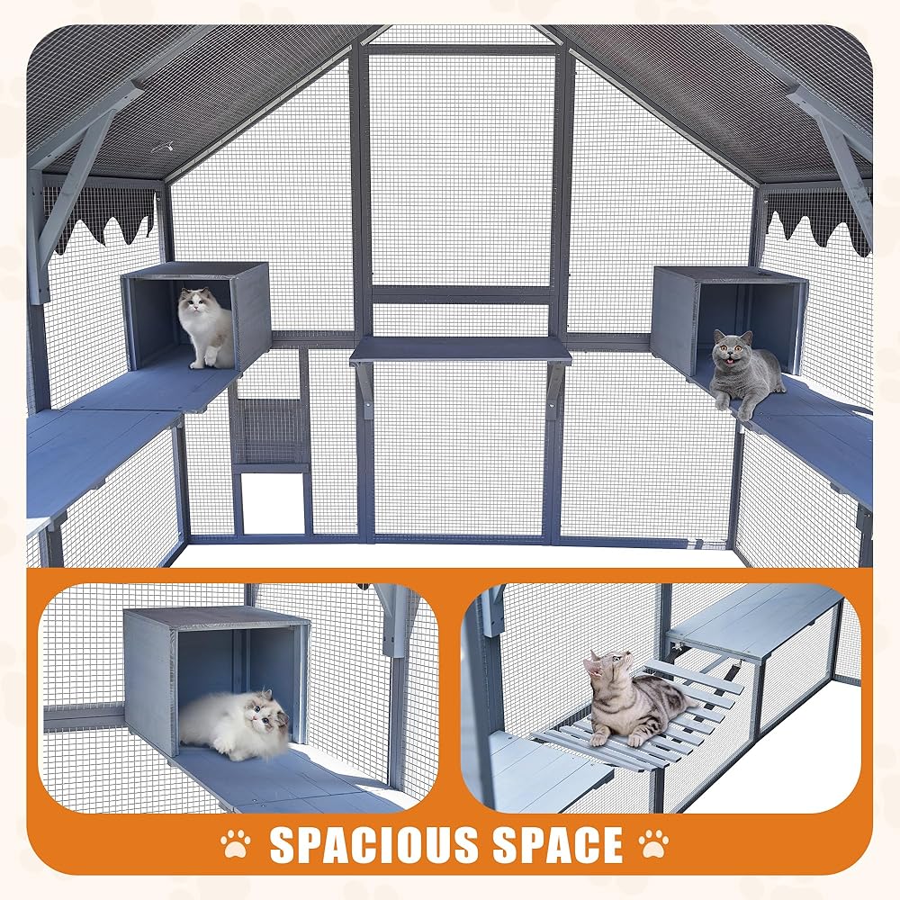 Comfort and Entertainment: Equipped with 2 bridges, 2 sleeping houses, and 7 cat walks, this cat outdoor enclosure is not just secure but also a source of comfort and fun, ensuring your cats have a cozy retreat and engaging play area.