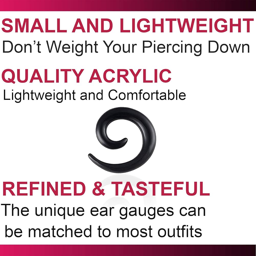 • SUPER LIGHT WEIGHT - 6 gauge 4mm plugs are very light weight and comfortable. FEATURES : 6g plugs for ears, black 6 gauge plugs, acrylic plugs for ears 6g, ear expander 4mm, 6g earrings acrylic spiral.