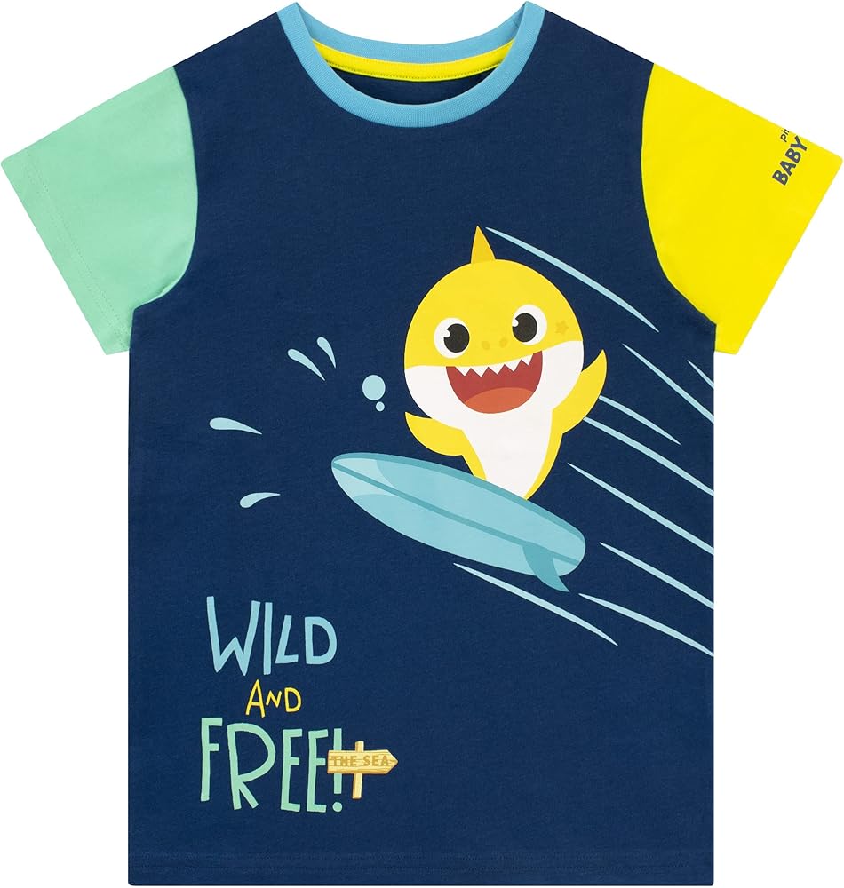 Boys Baby Shark T-Shirt. Baby Shark fans will love this fin-stastic navy tee with a large motif of Brooklyn the Baby Shark surfing with "Love the Ocean" wording and a little sign pointing to "The Sea". The yellow left sleeve features the Pinkfong Baby Shark logo, and the right sleeve is turquoise so this shark top will match the sun, sea and sky when they're at the beach! This adorable Baby Shark short sleeve shirt is a must have for sunny days