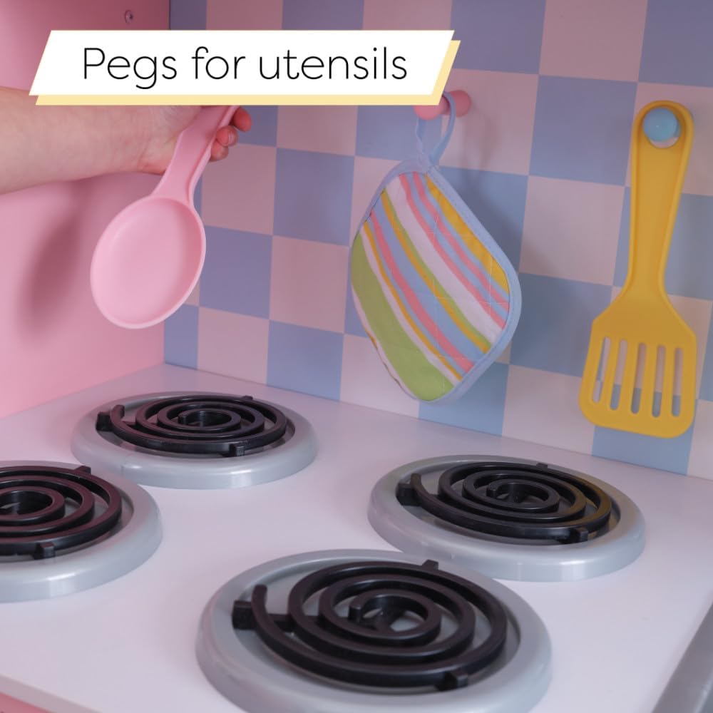 Classic Large Pastel Play Kitchen from KidKraft is a customer favorite for its expansive play space, tons of storage and all the appliances a child expects from a kitchen. The checkerboard backsplash provides a cheerful base for the hanging pegs that can hold the spoon, spatula and potholder. The stainless steel look knobs and sink await kids to come wash and cook up delicious pretend meals, just like mom and dad. The microwave, refrigerator and oven all have doors that open and close for hands-on fun. Made of wood, this play kitchen is ready to withstand years of exciting imaginative cooking.