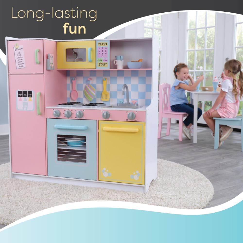 With the KidKraft Large Kitchen, the little chef in your home will be busy cooking up some creativity. Designed for children ages three and up, this solid, kid-sized kitchen has all the essentials including: a stove, oven, microwave, sink, and refrigerator. Decked out in bright colors with plenty of gadgets, this kitchen is set up for plenty of imaginative make-believe play.