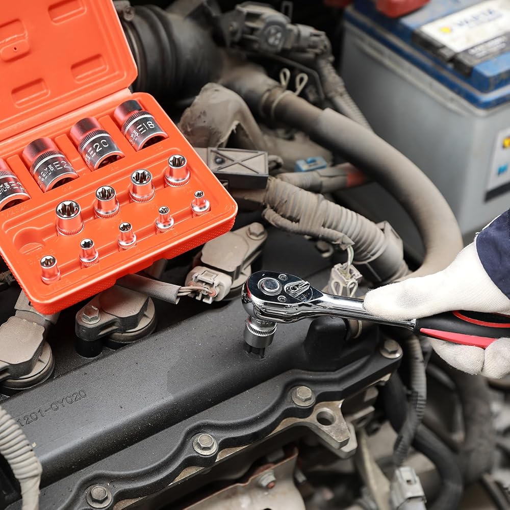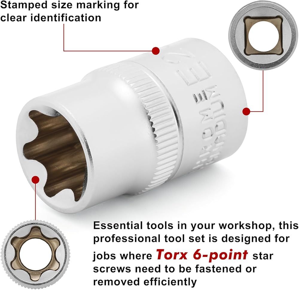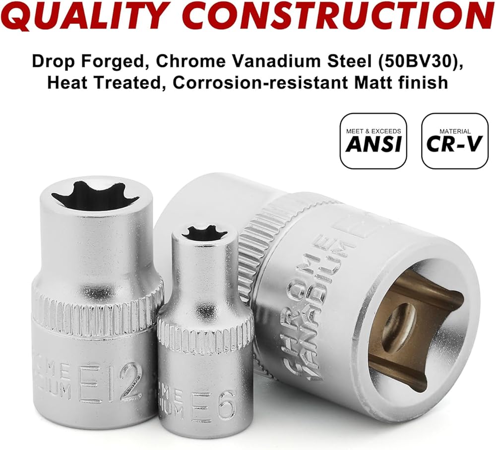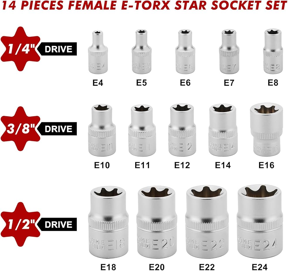 CASOMAN 14 قطعة مجموعة مقابس نجمة E-TORX أنثى، مجموعة مقابس نجمة خارجية أنثى، E4 - E24 مجموعة مقابس عزم الدوران، 1/4 بوصة Dr.3/8 بوصة Dr. 1/2" د.