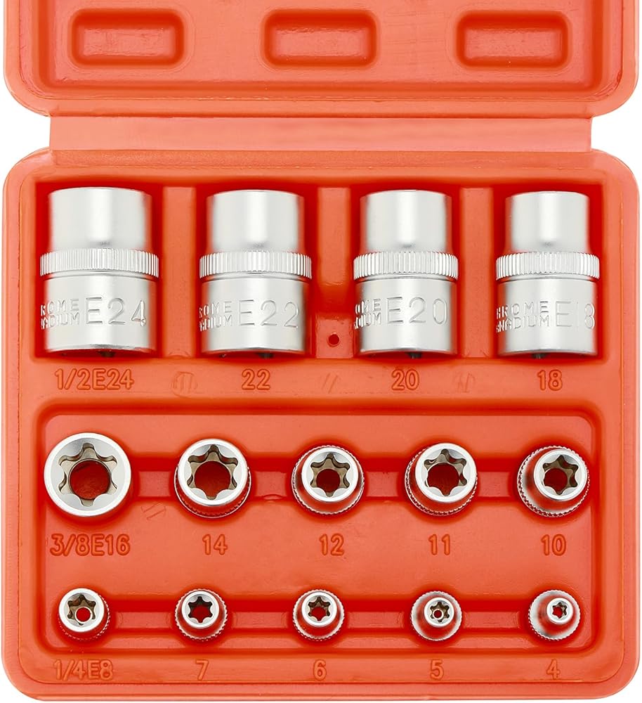 - تشتمل المجموعة على: 1/4 بوصة دكتور: E4، E5، E6، E7، E8، 3/8 بوصة دكتور:E10، E11، E12، E14، E16؛ 1/2 بوصة دكتور: E18، E20، E22، E24؛