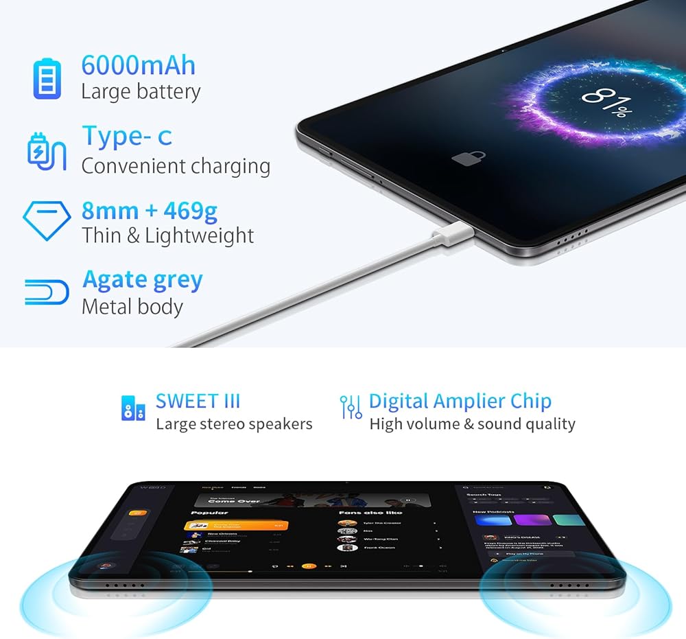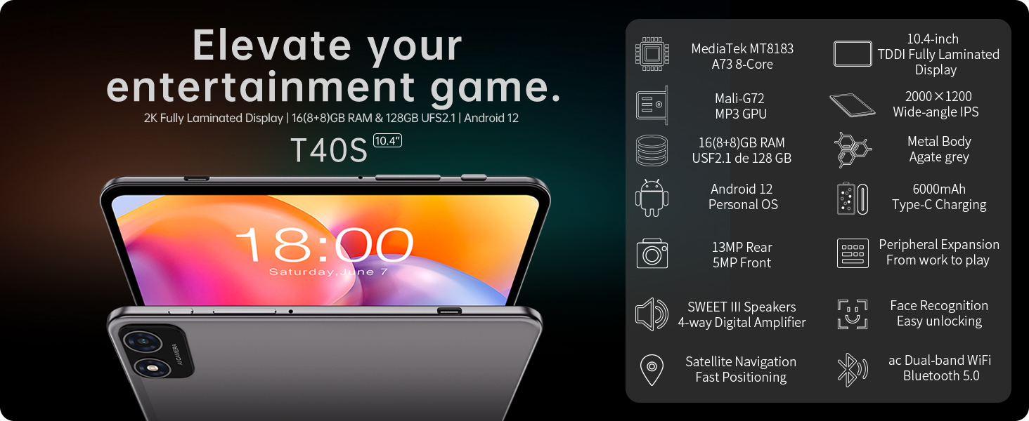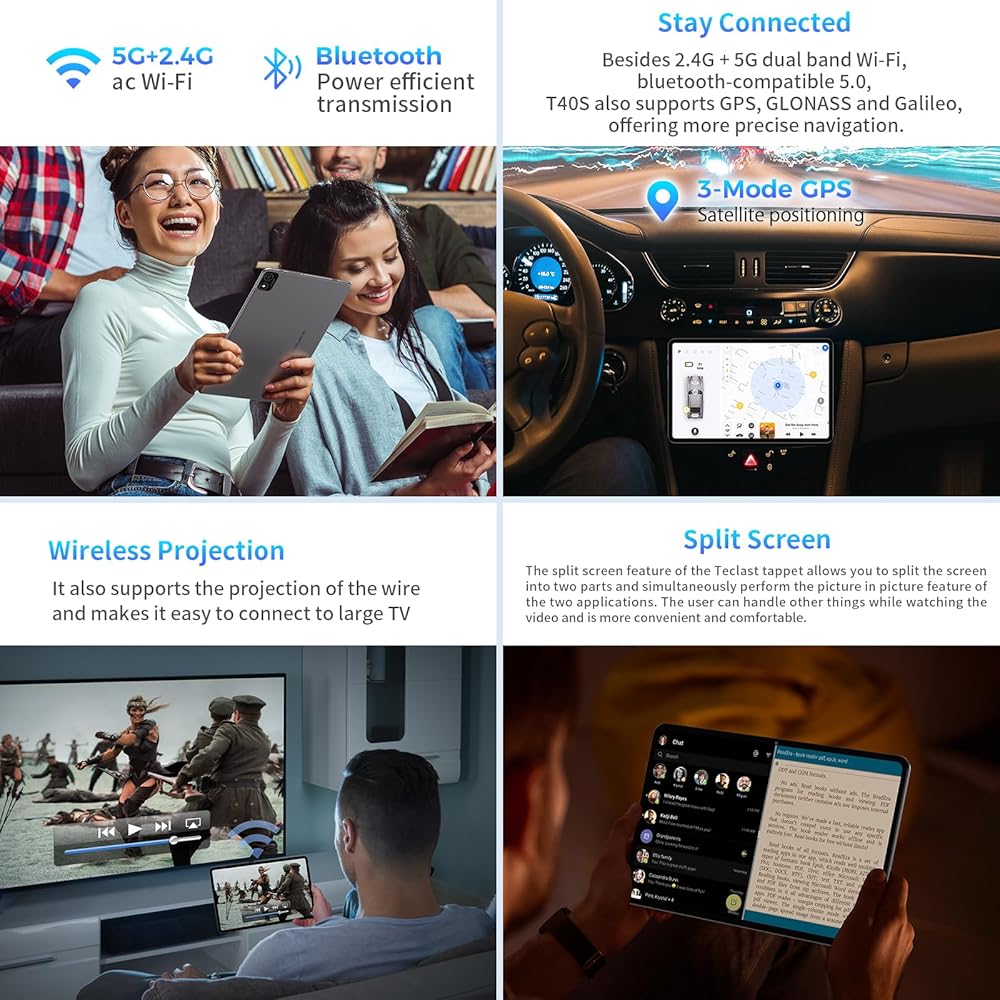 【واي فاي 2.4G/5G + 6000 مللي أمبير في الساعة + GPS】جهاز لوحي 10.4 بوصة مع واي فاي عالي السرعة ثنائي النطاق AC، نطاق تردد 5G أسرع، مما يوفر تجربة عبر الإنترنت مع تداخل لاسلكي أقل. جهاز لوحي T40S يعمل بنظام Android مزود ببطارية تصل سعتها إلى 6000 مللي أمبير في الساعة. يمكنك تحقيق ما يصل إلى 8 ساعات من عمر بطارية الفيديو، واستخدام منفذ Type-C للشحن بسهولة أكبر. كما أنه يدعم أنظمة الملاحة GPS وBeiDou وGalileo وGLONASS، وهو رفيقك المثالي للسفر