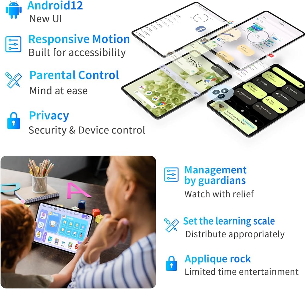 【جهاز لوحي يعمل بنظام Android 12 وGMS والتحكم الأبوي】يعمل هذا الجهاز اللوحي بنظام Android 12 ومعتمد من GMS، يمكنك بسهولة تنزيل مجموعة واسعة من التطبيقات والاستمتاع بها من متجر Google Play. يقوم الجهاز اللوحي بتثبيت تطبيق لمراقبة الأطفال لحل مخاوف الآباء بشأن طول المدة التي يستخدم فيها أطفالهم الجهاز اللوحي واختيار التطبيقات. يمكنه إدارة وقت استخدام الجهاز اللوحي واختيار التطبيقات والمشكلات الأخرى بشكل فعال، مما يسمح لجهاز T40s اللوحي بتحقيق توازن أفضل بين التعلم والترفيه