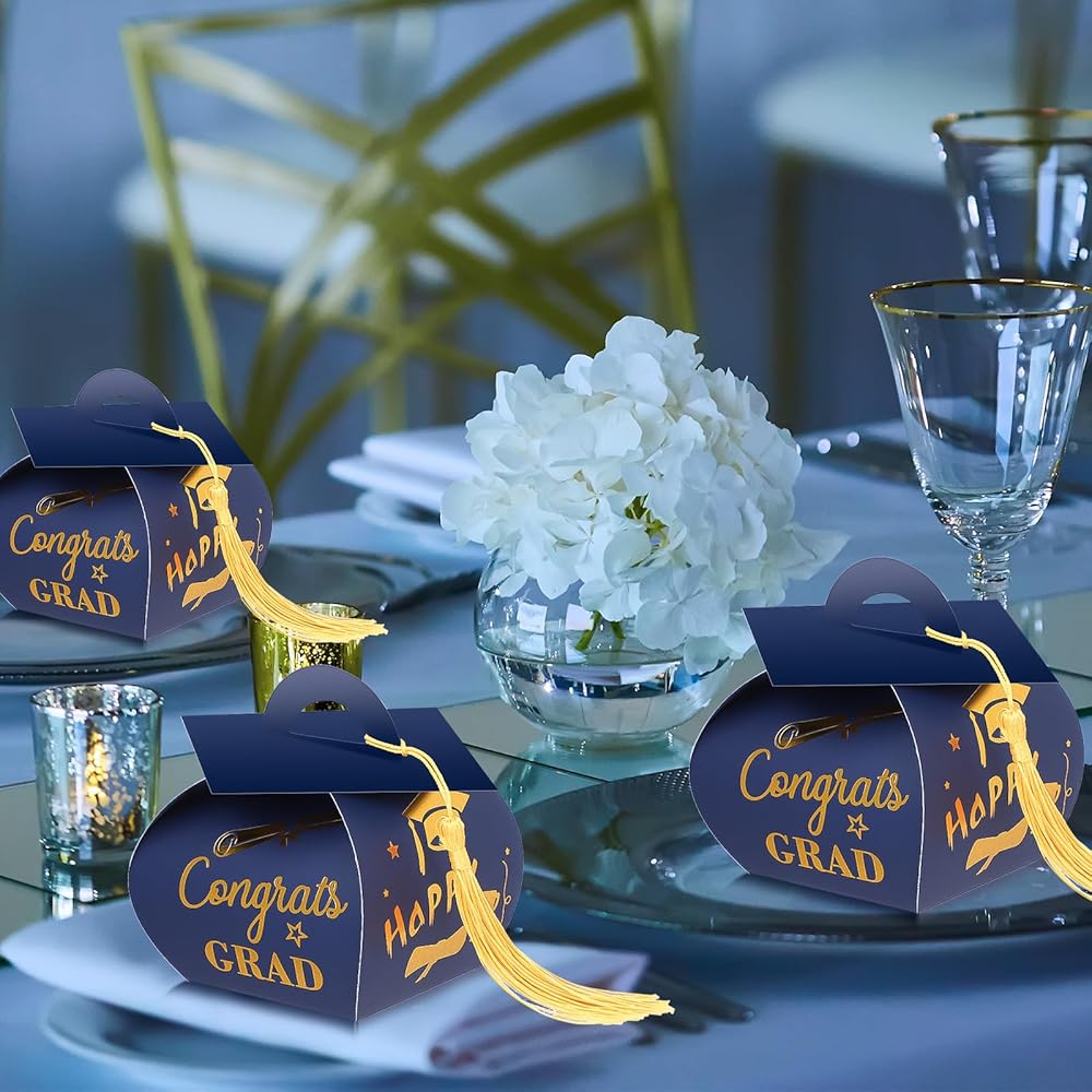 ISKYBOB 40 قطعة من علب هدايا التخرج، هدايا حفلات التخرج، صندوق حلوى التخرج مع زينة التخرج بشرابة، فئة 2024، حقائب حلوى مركزية للتخرج للطاولة (أزرق)