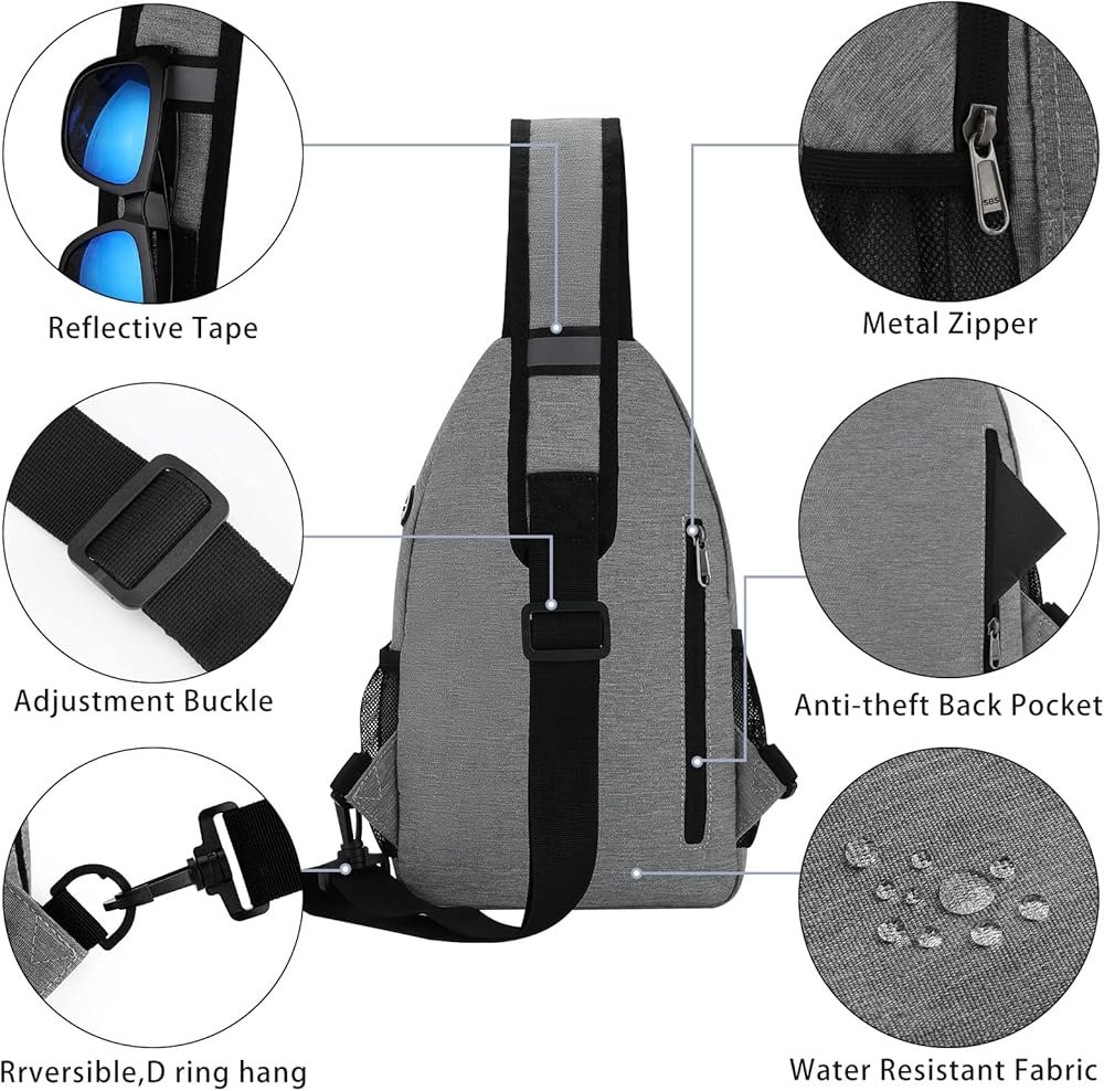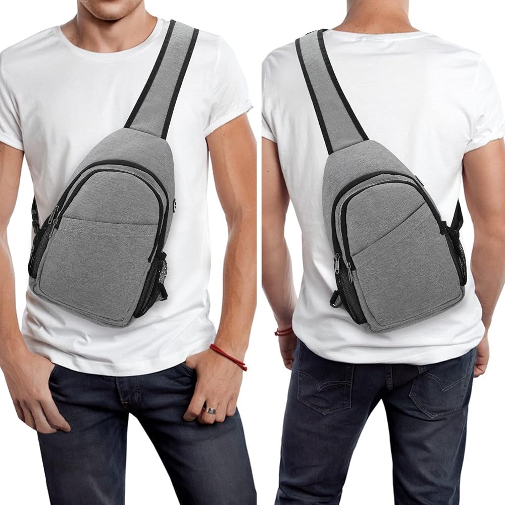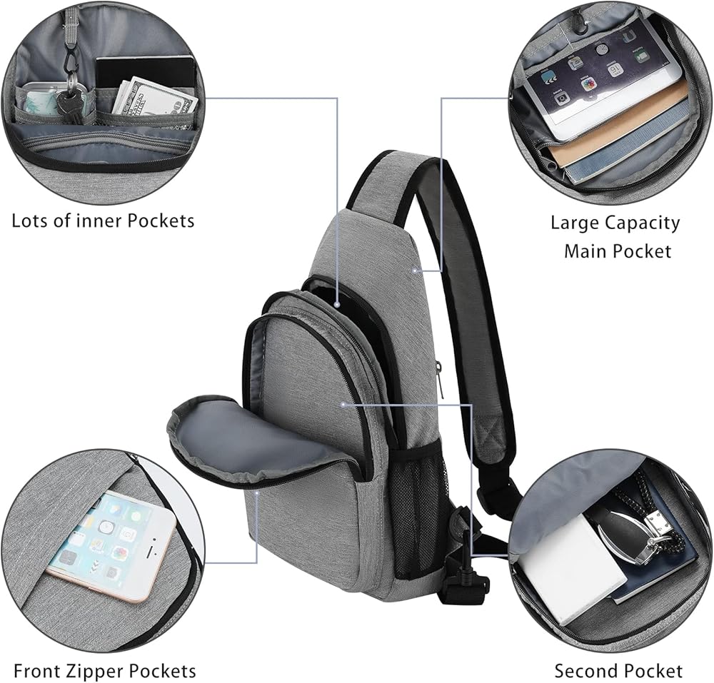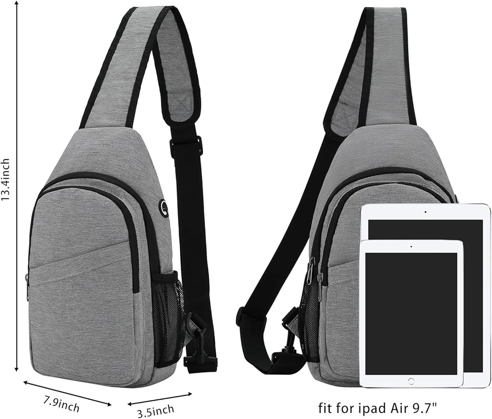 Keep Everything Organized: Dimensions: 13.4x7.9x3.5 inches / 34x20x8.9 cm. The sling bag contains 2 main pockets, a front pocket,two side pocketsand a back pockets. The main pocket can put iPad, notebook, power bank, etc. and the front pocket can put mobile phone. Side pockets hold water glasses and umbrella. There are also multiple small pockets for your passport, cards, pens and more. Allows you to arrange your items in an orderly manner, making travel more convenient.