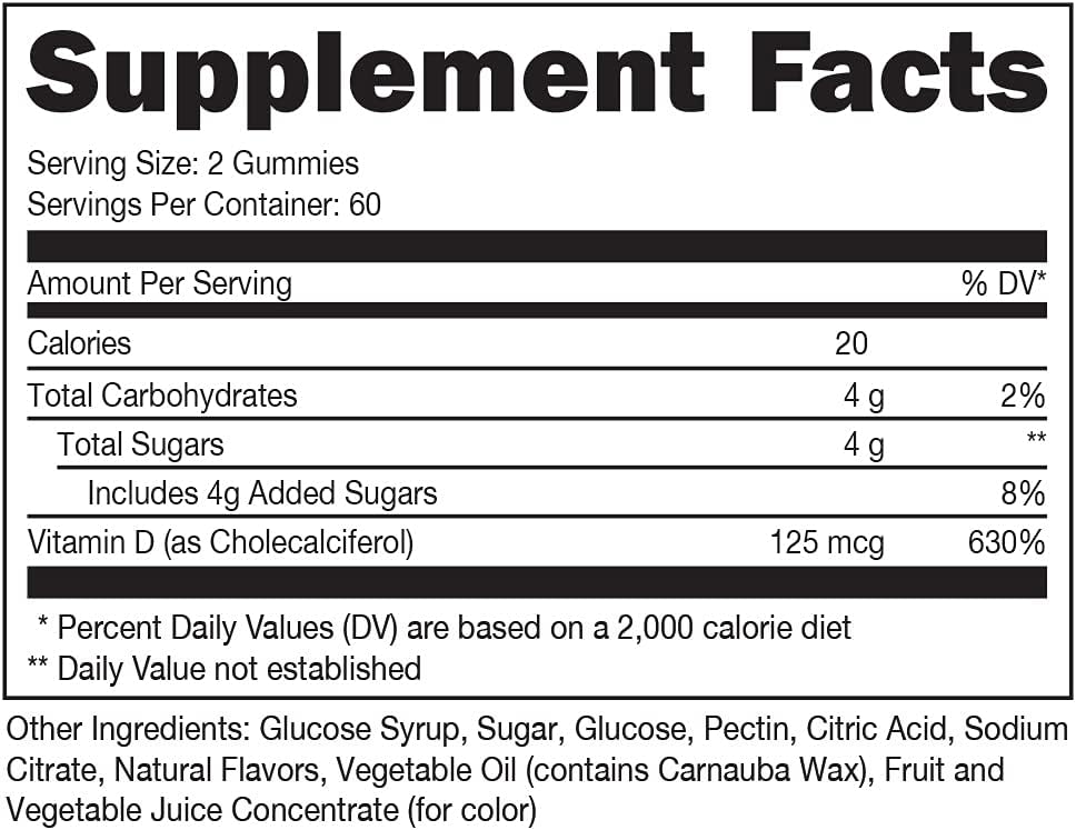 المحتوى والكمية: تحتوي العبوة على 120 علكة، تحتوي كل منها على 125 ميكروجرام من فيتامين د3.
