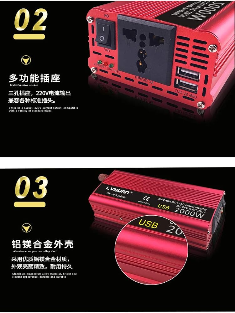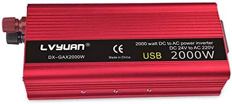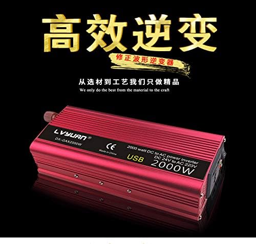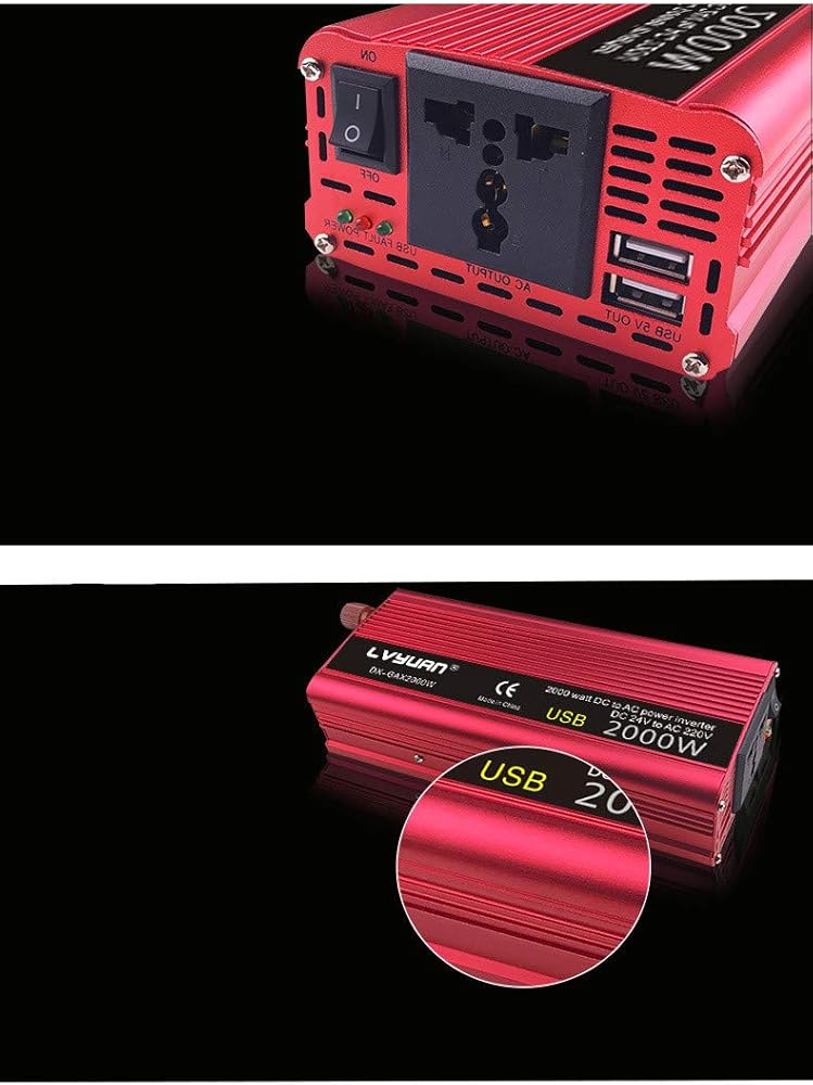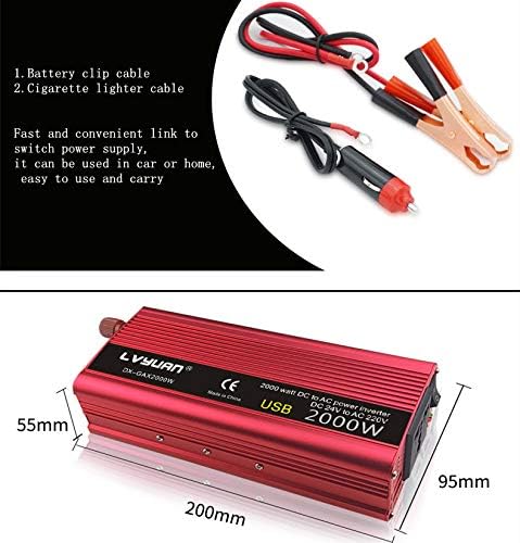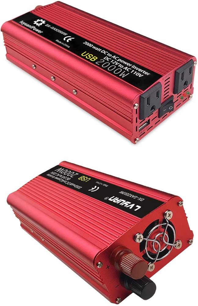 عاكس طاقة باور برايت 2000 وات 12 فولت، منافذ تيار متردد مزدوجة 110 فولت، موجة جيبية معدلة، مصدر طاقة احتياطي للسيارات مثالي لحالات الطوارئ أو الإعصار أو العاصفة أو الانقطاع، أحمر