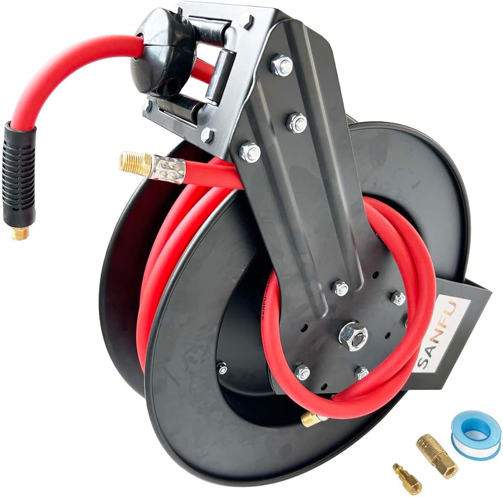 SANFU بكرة خرطوم هواء قابلة للسحب على الحائط والسقف مع خرطوم هجين مقاس 3/8 بوصة × 50 قدمًا مع 3 أقدام من الرصاص، بكرة فولاذية متينة تعمل بالهواء المضغوط وترجيع تلقائي 300 رطل لكل بوصة مربعة