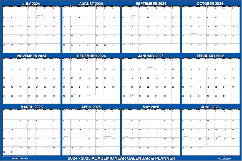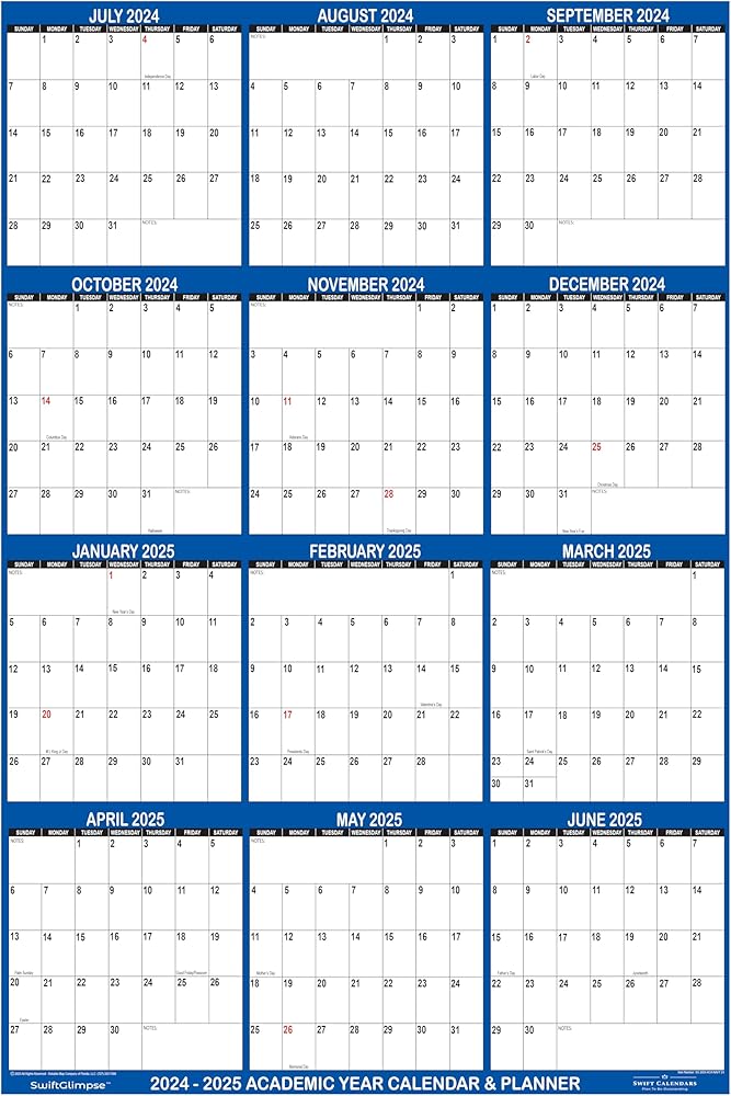 Get a large picture glimpse of your entire year with the SwiftGlimpse 2024 / 2025 Academic Series Erasable Wall Calendars. One huge poster displays all 12 Academic School Year months (JULY 2024 - JUNE 2025) in one jumbo view to keep you organized throughout the school. Large months and blocks allow you to fill out your year as you see fit. SwiftGlimpse Academic Wall Calendars will perfectly fit all your planning needs! Track projects, semester plans, school holidays, schedule vacations or just look ahead. Each calendar is laminated on both sides with a durable 3mil lamination so you can easily write or erase with wet or dry erase markers. Wet-Erase Markers are highly recommended! Wet-Erase Markers will not ghost or stain like dry-erase. SwiftGlimpse wall calendars will give you plenty of space to jot down important notes and for the academic year. Also included are brass grommets in all four (4) corners for quick and easy wall hanging. No need for messy tapes or foam adhesives that will damage wall. Only the best from SwiftGlimpse - the new industry leader in large erasable wall calendars. Proudly Made in America!
