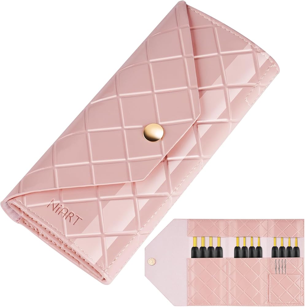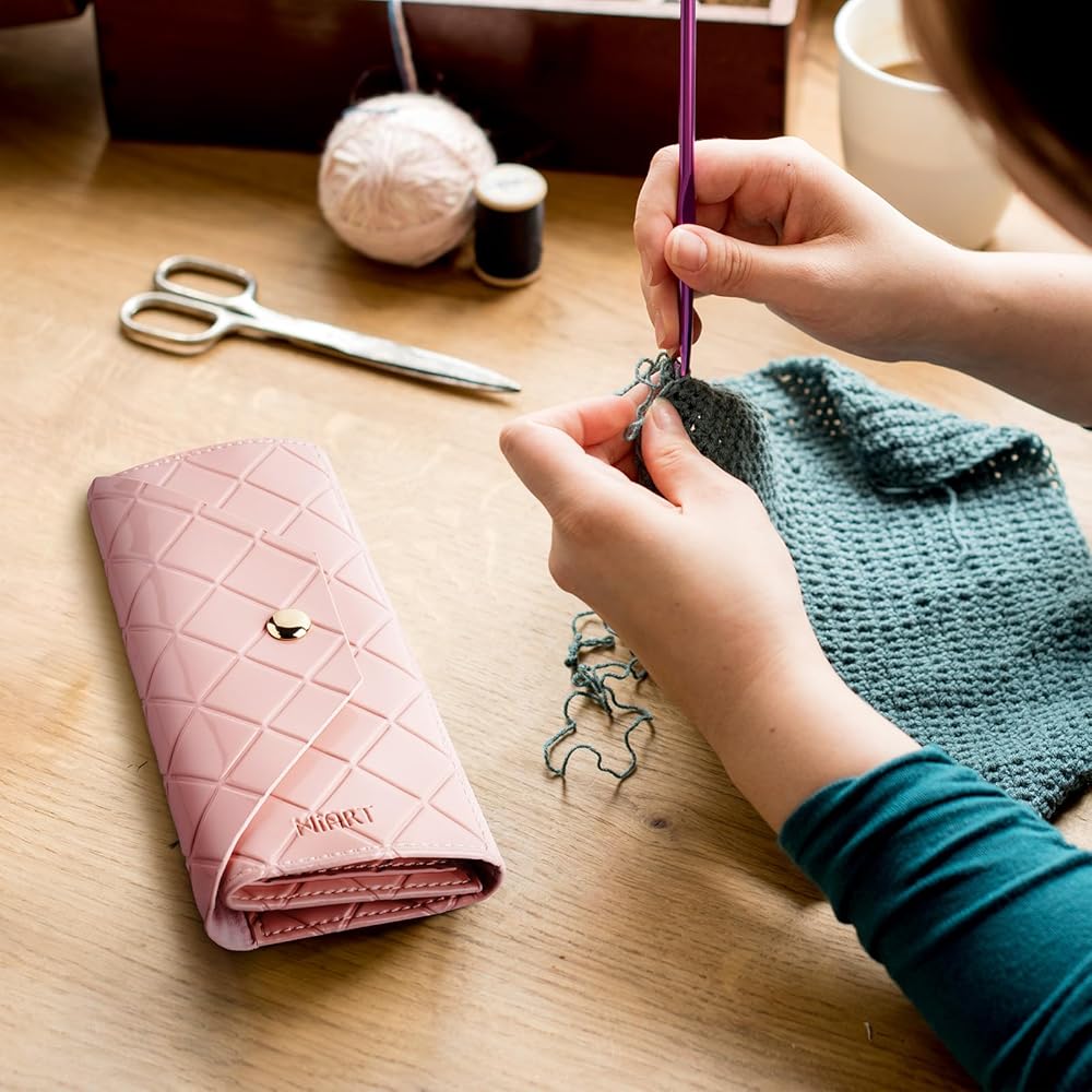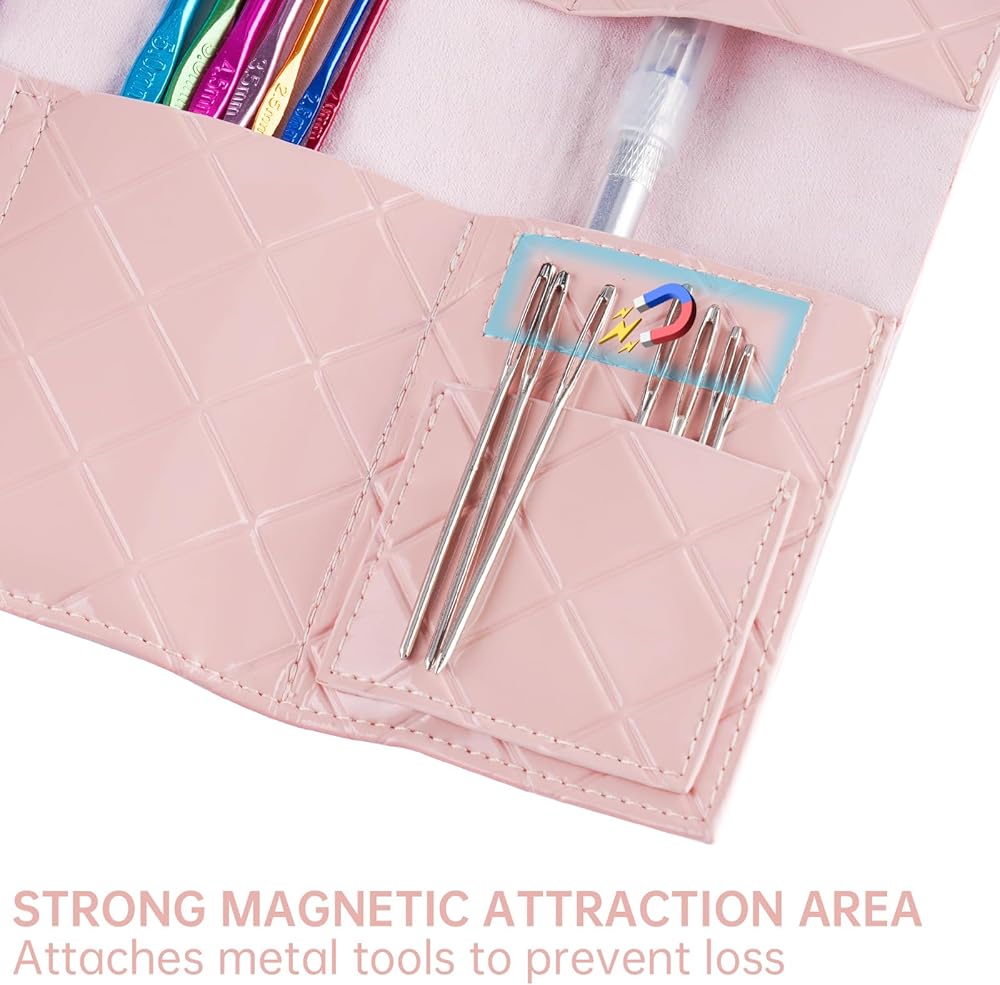 NiArt PU Leather Crochet Bag Organizer for On-the-Go Crafting, Portable Magnetic Crochet Hook Holder with 3 Compartments - Lightweight & Compact Storage Solution for Hooks, Pens & Craft Items (Pink)