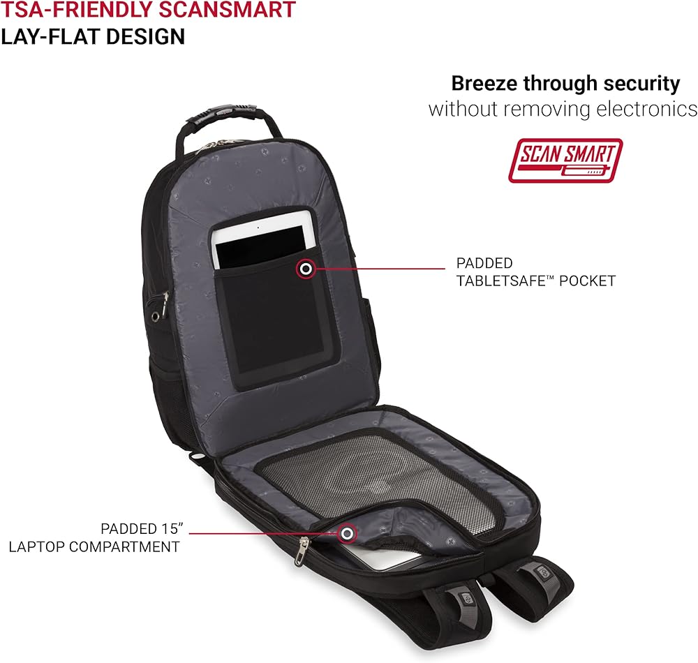 TSA-FRIENDLY FUNCTIONALITY: A lay-flat ScanSmart compartment features a 17” laptop compartment and a floating mesh tablet pocket. The compartment allows for your backpack to be scanned at a TSA checkpoint without having to remove your laptop from the case.