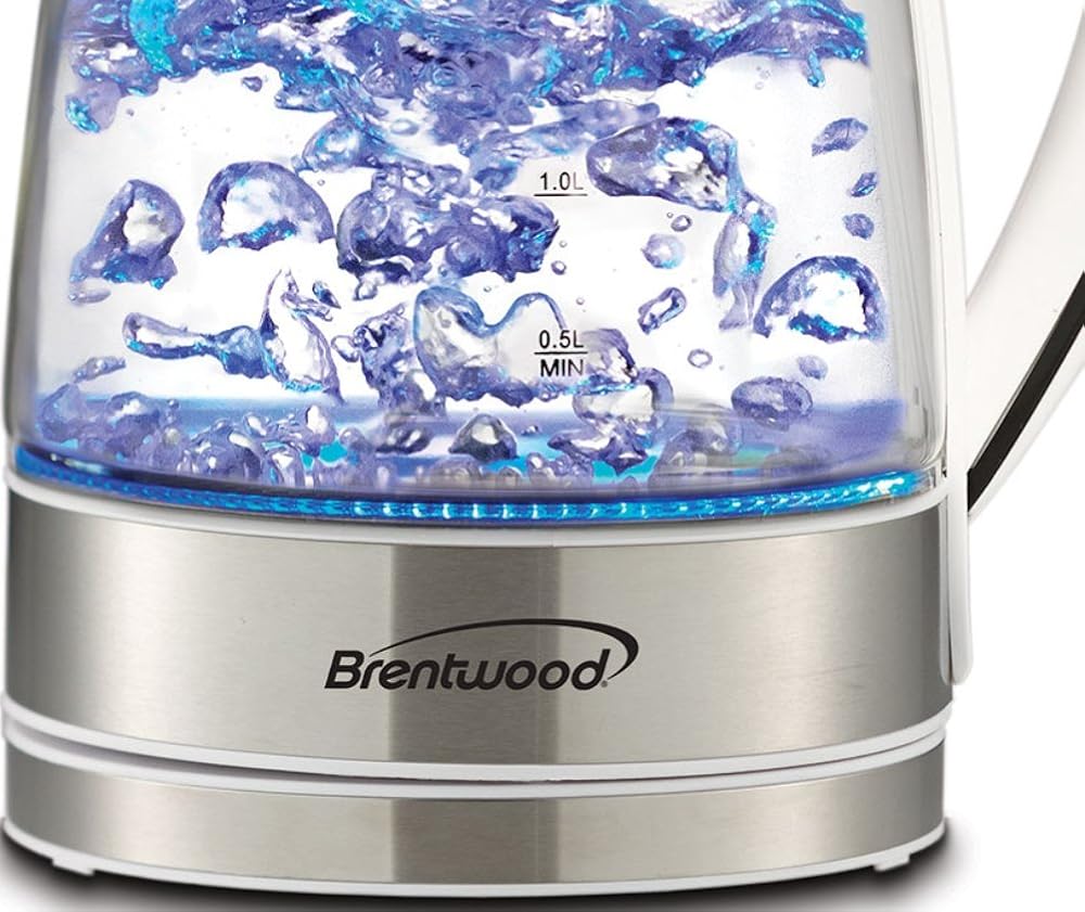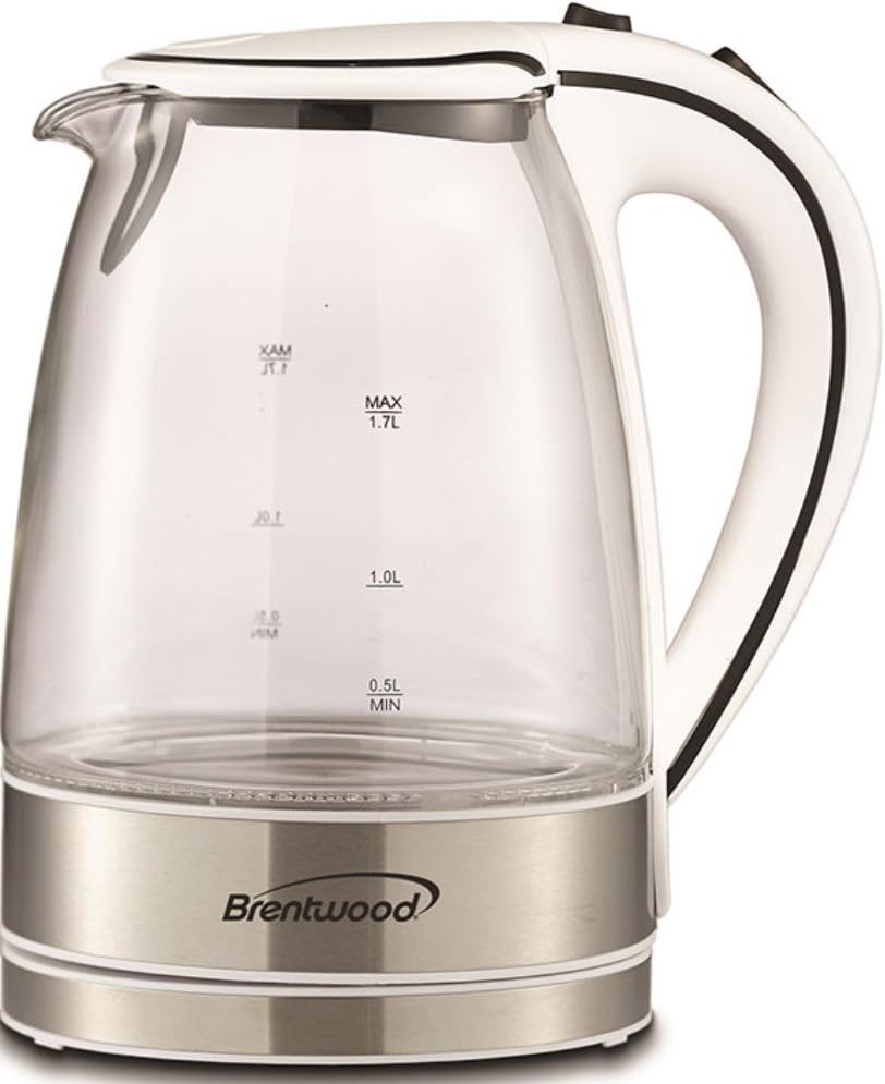 The Brentwood KT-1900W 1.7L Cordless Glass Electric Kettle boils water faster than a microwave and safer than a stove top kettle. Water boils within minutes with a single push of a button. Blue LED lights up glass kettle while boiling. Cordless kettle lifts off the 360 swivel base for easy filling and pouring. Conveniently make hot tea, French press or pour over coffee, instant oatmeal and more. Full glass kettle, concealed heating element and BPA Free parts keeps water free of impurities. Includes boil dry and overheat protection for added safety. Unit automatically shuts off once water reaches a boil.