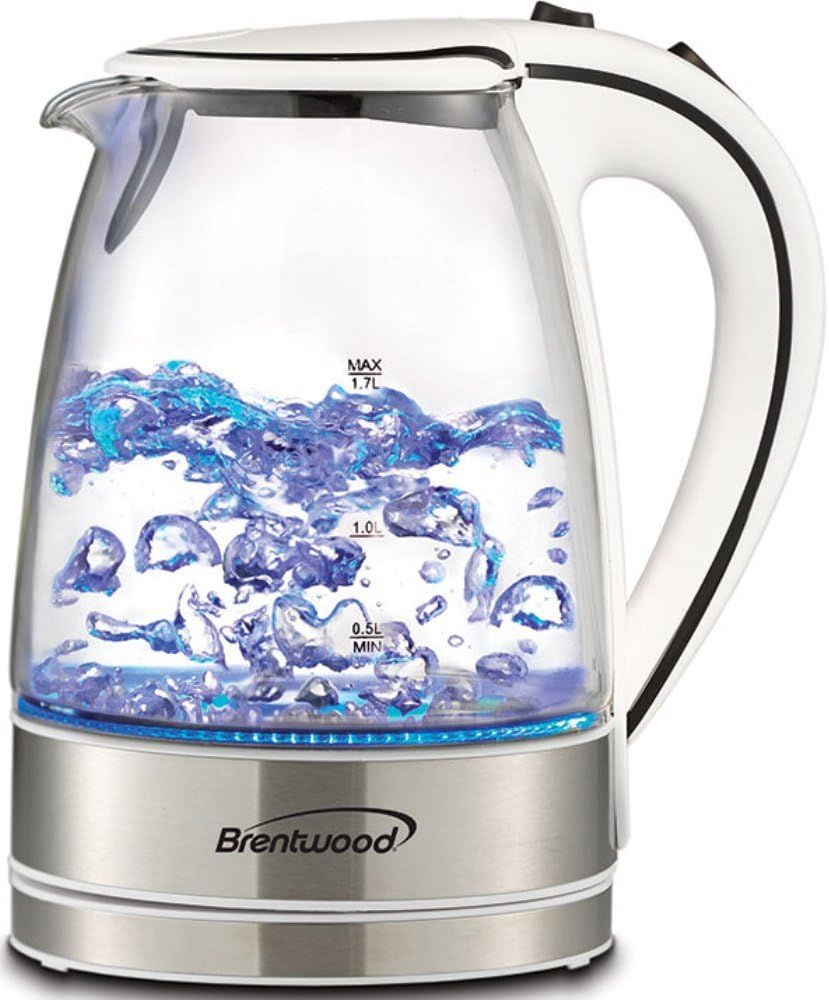 Brentwood KT-1900W Cordless Glass Electric Kettle, White, 1.7 Liter Volume Capacity, 1100 Watt Power, Blue LED Illuminates Kettle While Boiling, 360 Swivel Base with Cord Storage