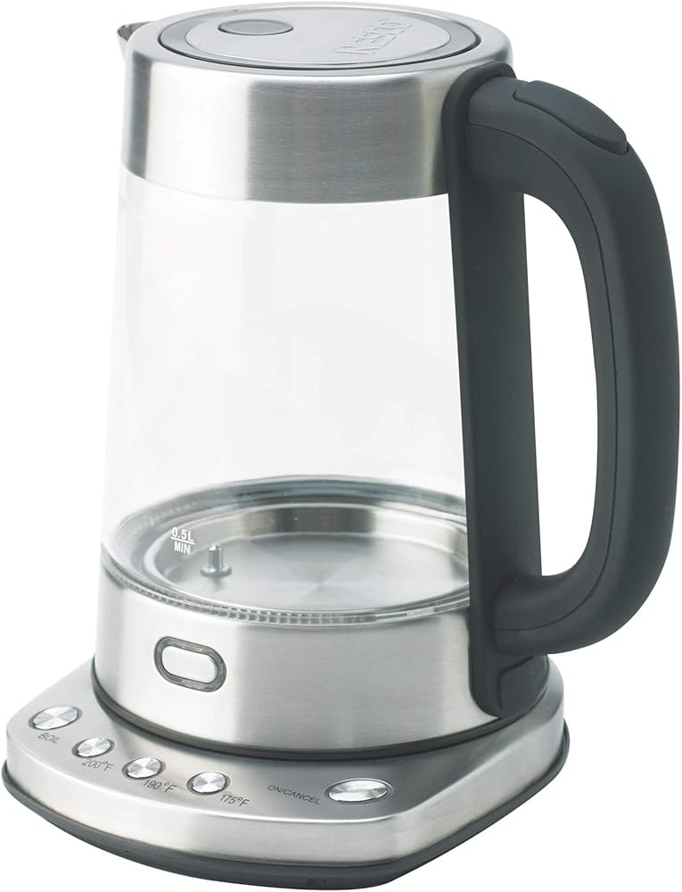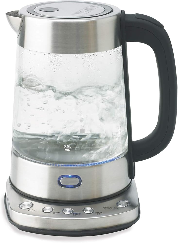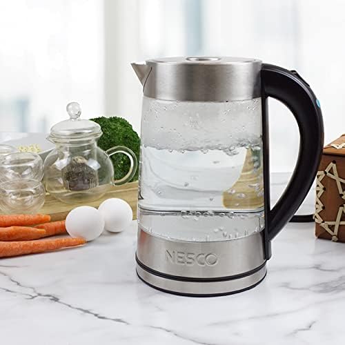 Quickly boil water to make instant coffee, tea, hot chocolate and more with the 1.8-quart Nesco Electric Glass Water Kettle. Uses about half the energy of a stovetop and boils faster than most microwaves. Perfect for kitchens, dorm rooms, offices and RVs to use for instant soups, oatmeal, hot cereals, ramen noodles, boxed mac & cheese, gelatin and rice. Featuring a stainless steel concealed heating element and trim. The glass pitcher includes level marks and is BPA free. Kettle turns off when it reaches boil temperature or keep warm at lower setting for 30 minutes. This water kettle has a 360-degree swivel power base with a cordless glass pitcher, cord storage, LED power indicator light and auto shut-off protection for safety. UL-Certified. 1500 watt.