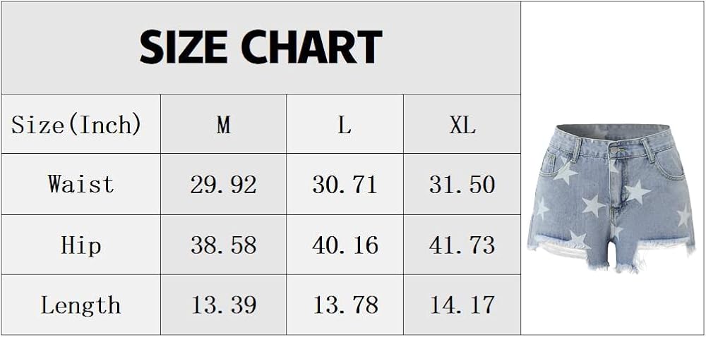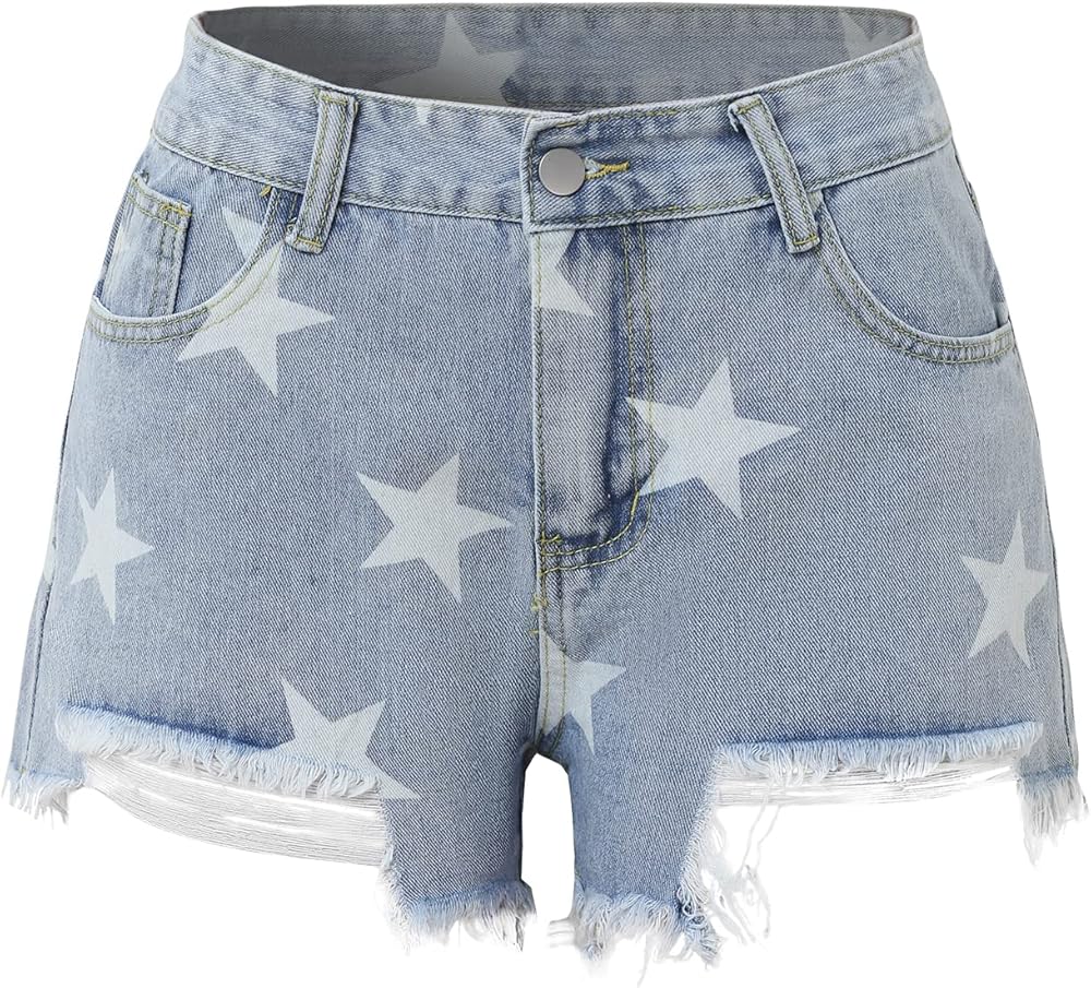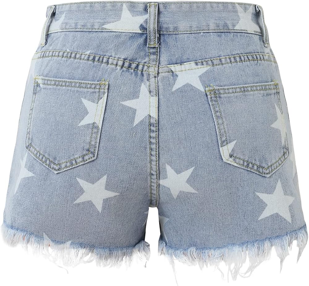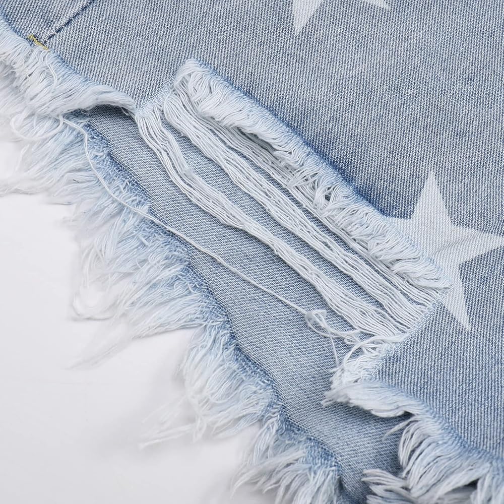 【Features】High waist, star print, five-pocket design, button closure and zipper placket, ripped hem, torn notch hem, cool summer hot shorts, cute ripped denim shorts, sexy denim hot pants, suitable with tops, shirts, tank tops, camisole, tunic outerwear, sun protection jackets, sandals, slippers, canvas shoes, sneakers, etc., to create a fresh and cool summer fashion look.