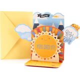 Cover features cheerful "Happy graduation" lettering and a smiling sun. Gently pull up on the die-cut design at the top of the card to reveal an exciting 3-D paper display, and press the button to hear Pharrell's "Happy." Inside reads: "You did it! Big day! Bravo! Big deal! So happy for you."
