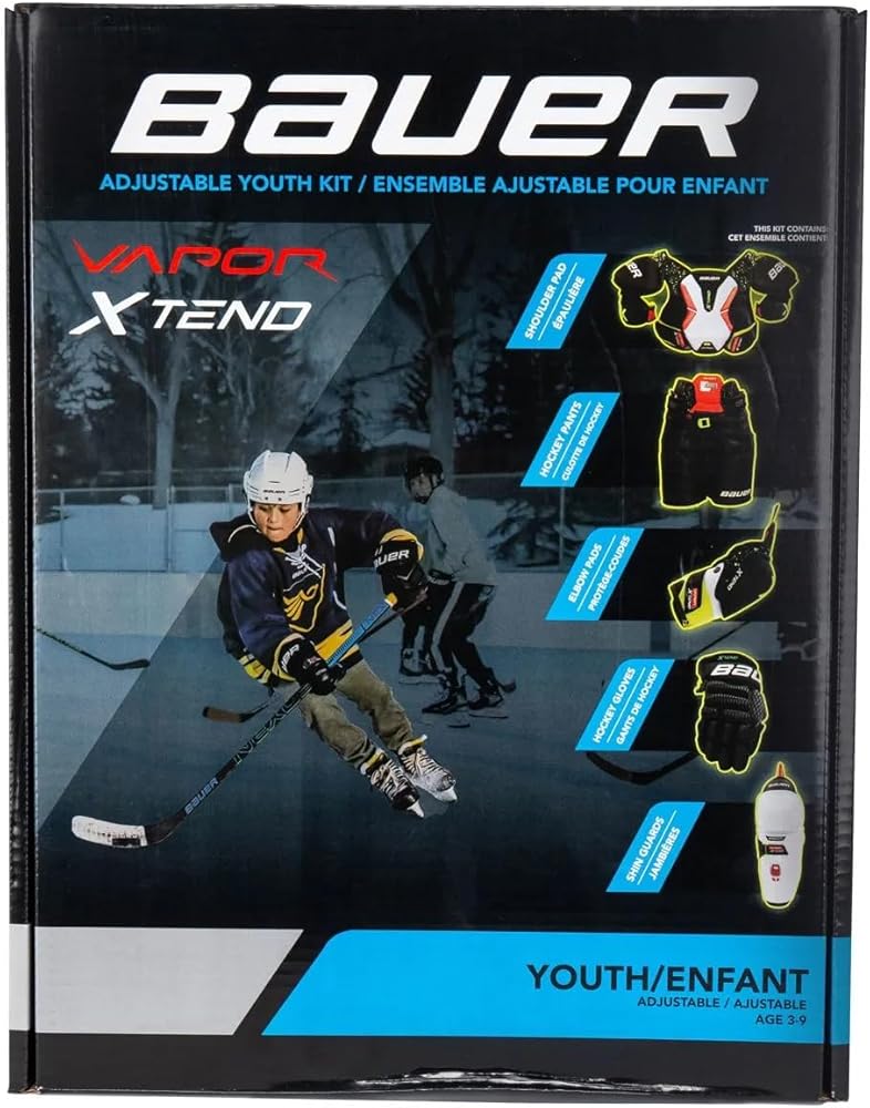 This beginner hockey equipment kit from Bauer is the perfect way to set up your young player for success on the ice. The VAPOR X-TEND PROTECTIVE KIT contains everything needed to keep them safe as they learn the game - gloves, pants, shin pads. adjustable shoulder and elbow pads that grow with them. Designed for ages 3 to 9, each piece is constructed with an innovative built-in extension system allowing the pads to expand to fit growing bodies over multiple seasons. This eliminates the need to constantly purchase new protective gear and saves both time and money. With lightweight and breathable materials to keep players comfortable in any weather, this starter set has everything they need to focus on having fun and developing their skills without worry.