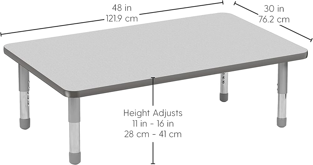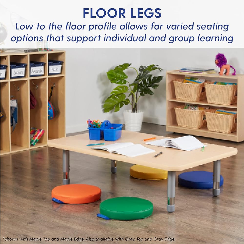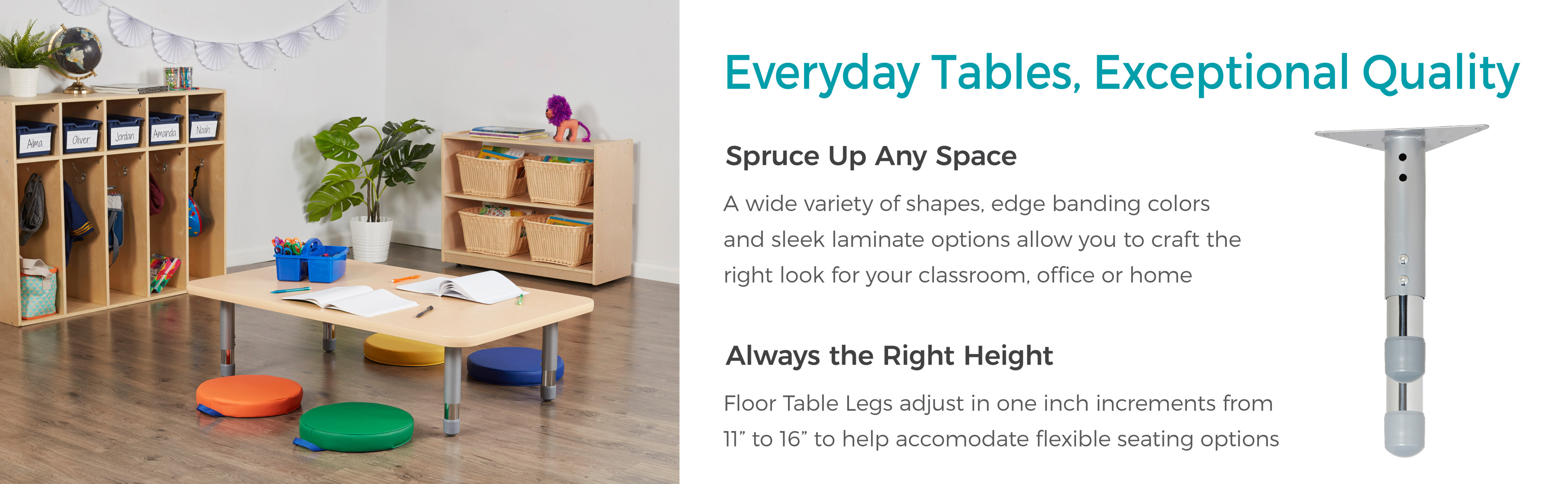 Create a low-profile activity space with the Floor Leg Tables! With legs that adjust in 1-increments from 11-16 inches, these short tables are designed for use with floor cushions and other flexible seating options. The laminate table top is easy to clean between activities and features a T-molded edge band to protect from everyday wear and tear. NOTE: Item ships and arrives in multiple boxes. Delivery times may vary with each box.