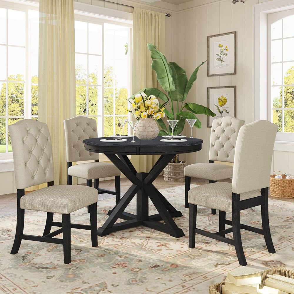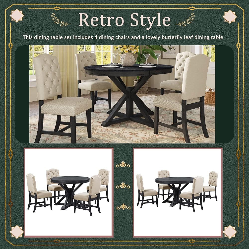 💕【5-Piece Retro Dining Table Set】- Retro Dining Table Set for 4 Person including 1xTable+4 Chairs. Table 42"-58"L x 42"W x 30"H, 71.5 LBS; Chair 20.1"L x 24.8"W x 39.4"H, 17.6 LBS/piece. ▲▲▲ Please note that A total of 3 Package BOXES may not be delivered at the same time.