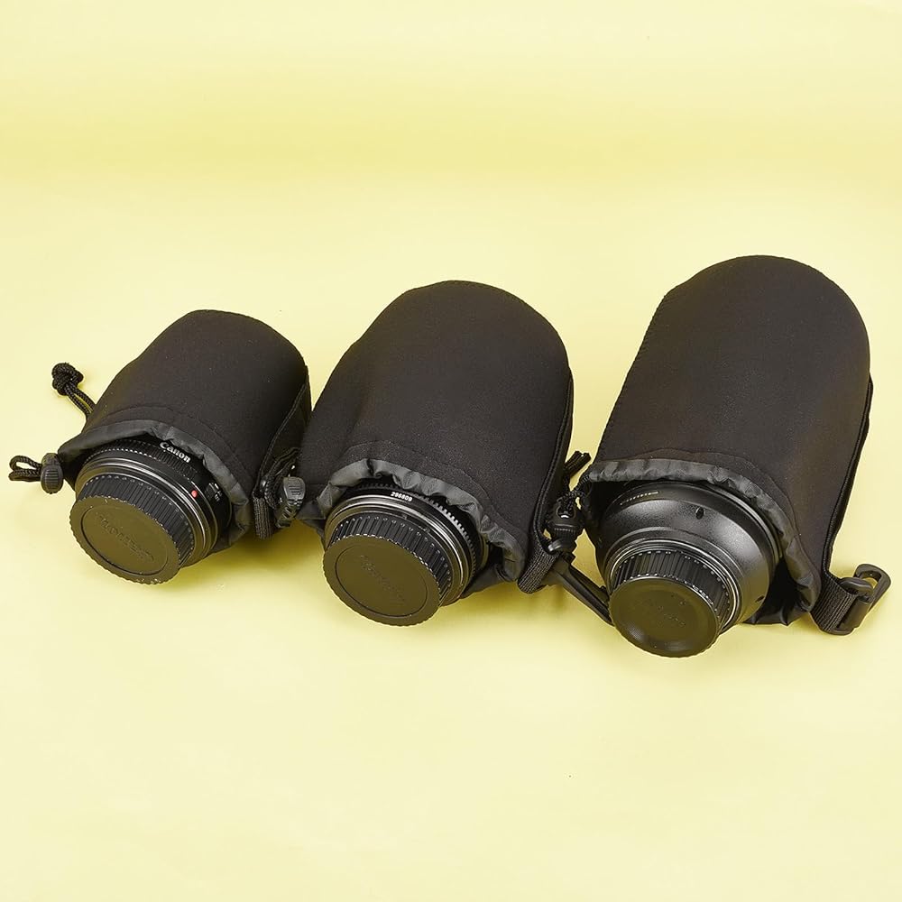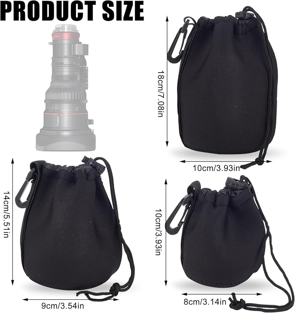 PACKAGE CONTENT: This set includes three neoprene lens pouches in different sizes (S, M, L). The small one is 10cm long, the middle one is 14cm long and the large one is 18cm long.