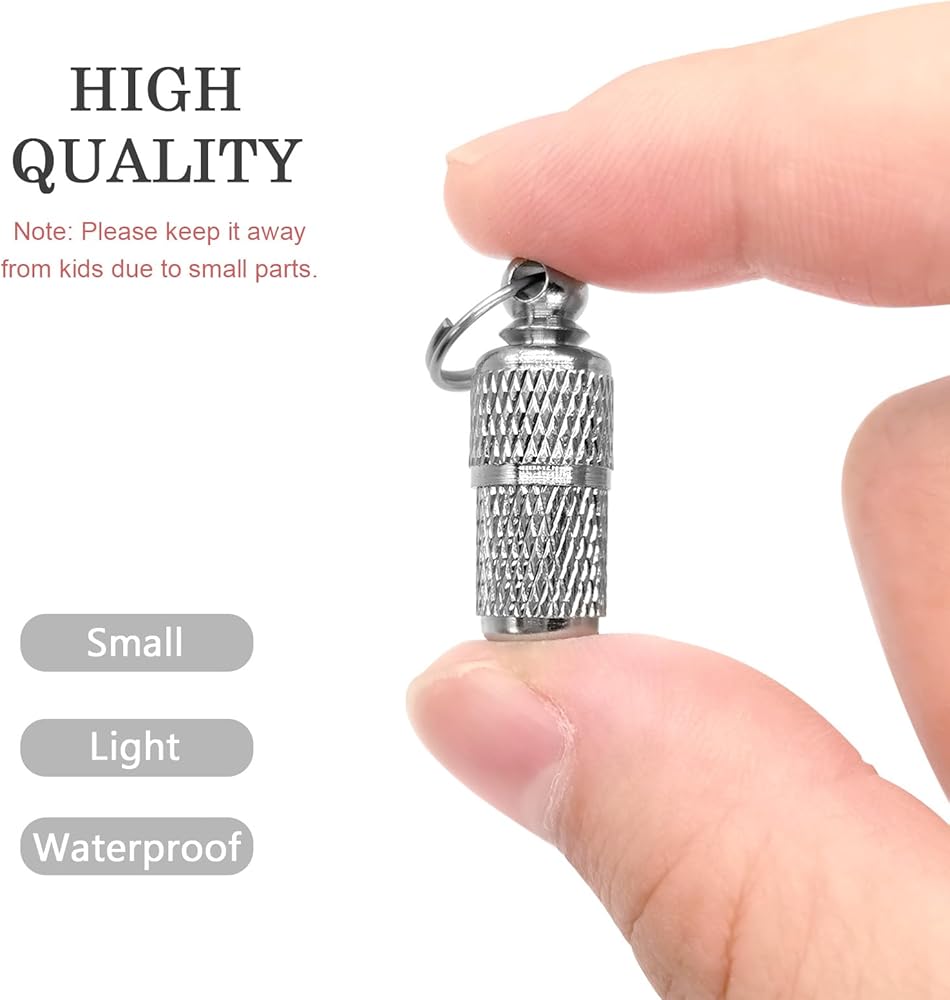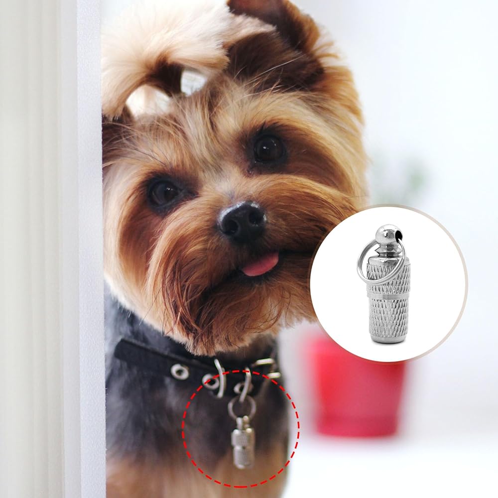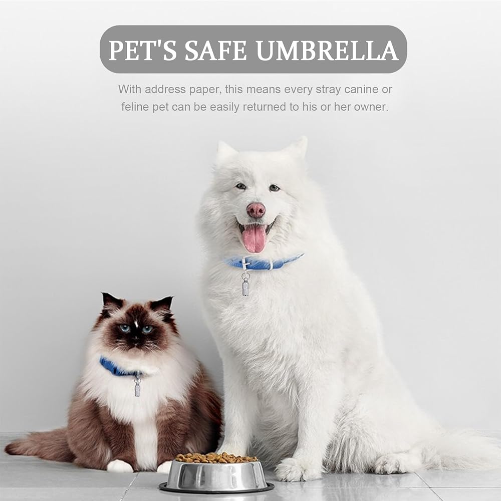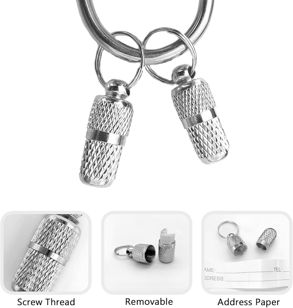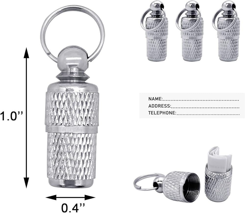 Pet collar name tags are perfect for cats, dogs and other pets. Can also be hung on a key or used to carry emergency pills.