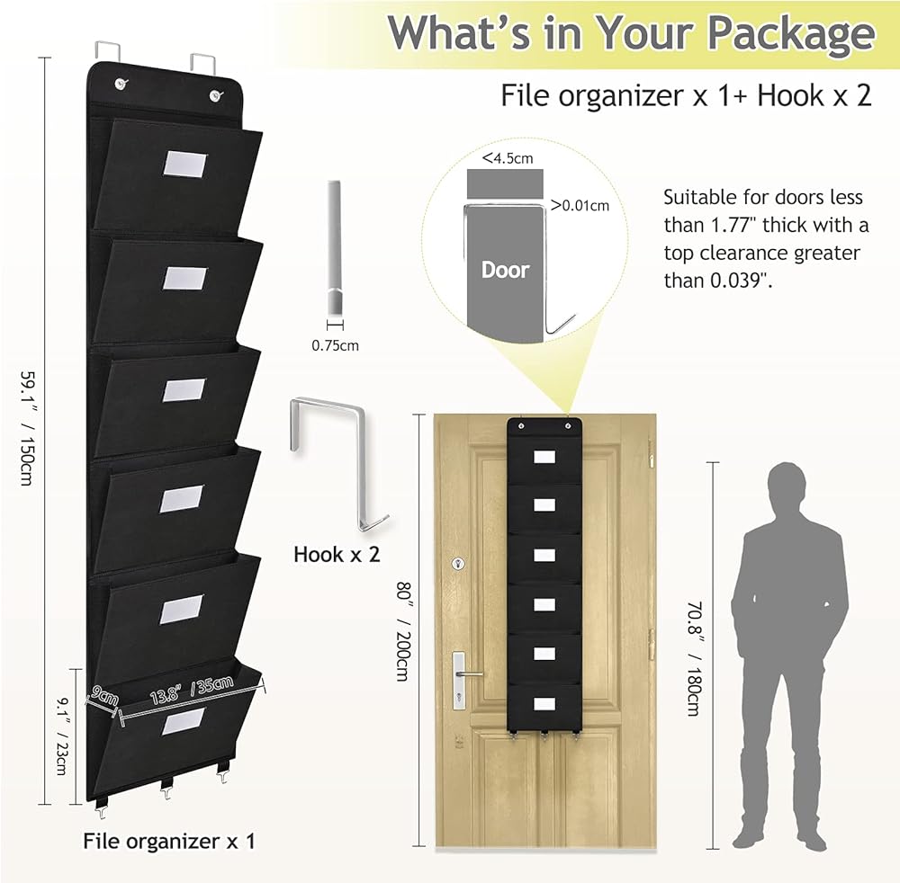 • 【منظم ملفات حائط بسعة كبيرة】6 جيوب كبيرة بقياس 13.8 بوصة طول × 9.1 بوصة ارتفاع، تزيد من استخدام المساحة الرأسية وتحسين نظام حفظ الملفات الخاص بك، مثالية لزيادة خيارات التخزين. سوف تحصل على منظم حائط المكتب*1، وخطاف معدني*2، مناسب للباب بسمك يصل إلى 1.77 سم.