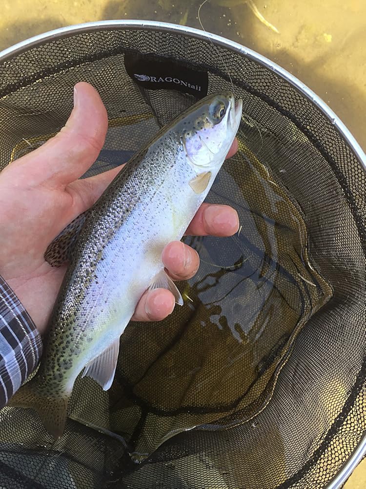 DAMO nets are very common in Japan and are a great choice for streams and small river fishing commonly done with Tenkara. Our DRAGONtail DAMO Tenkara net comes with a lanyard that is connected to the handle just below the net hoop so it does not get tangled in your wading belt. The Lanyard stretches long enough for you to fully extend your arm. The smooth pointy handle easily slides in and out of your wading belt for easy use. The handle grip shape is wide and fills your hand for a very comfortable grip that is easy to hold and scoop fish. Our handle is longer than many damo net handles found in Japan but Americans are commonly taller and this long handle comes in quite handy when reaching to scoop up a fish. The hoop slightly bends down from the handle for easier scooping and keeping the net away from the body when in your wading belt. The hoop of the net is 30cm, which is about 12 inches wide. This size is big enough to hold a decent size fish. The net shape is a bucket shape making it easy to access the fish to remove hook with less tangling.