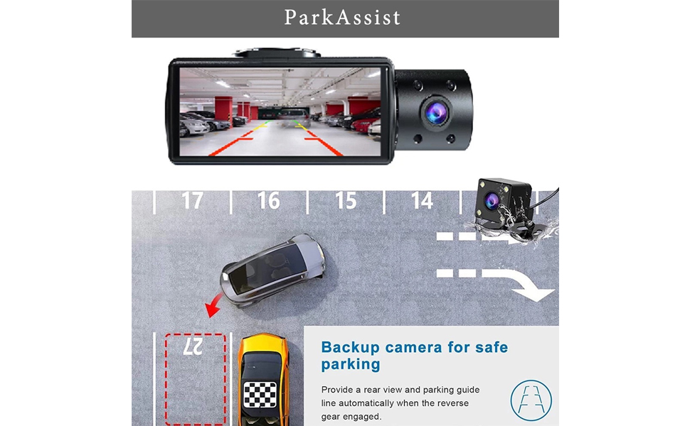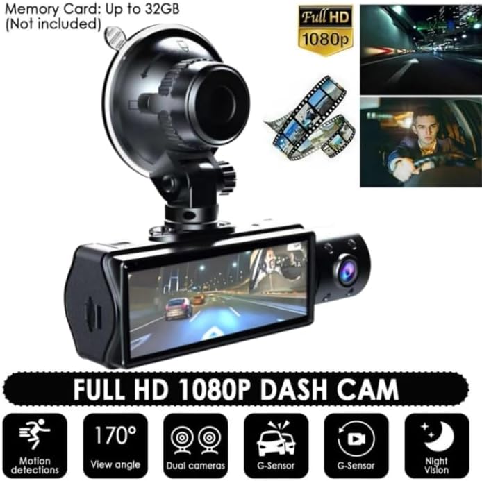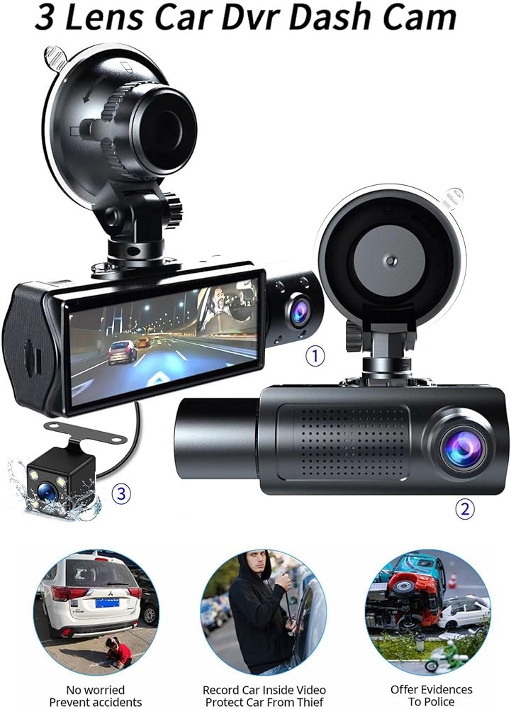 كاميرا داش كام أمامية وداخلية وخلفية 1080 بيكسل فل اتش دي للسيارات، ثلاث عدسات، شاشة عرض 3.16 بوصة ومسجل سيارة بزاوية واسعة للغاية 170 درجة، كاميرات لوحة القيادة للرؤية الليلية بالأشعة تحت الحمراء مع صورة عكسية
