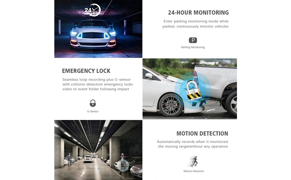 【قفل فيديو الاصطدام التلقائي】- مستشعر G/مراقبة ركن السيارة وتسجيل الدورة. يكتشف مستشعر G المدمج في كاميرا لوحة القيادة الاصطدامات ويقفل ويحفظ التسجيلات المقابلة تلقائيًا، مما يضمن حفظ الأدلة الرئيسية لمطالبات التأمين والأغراض القانونية.