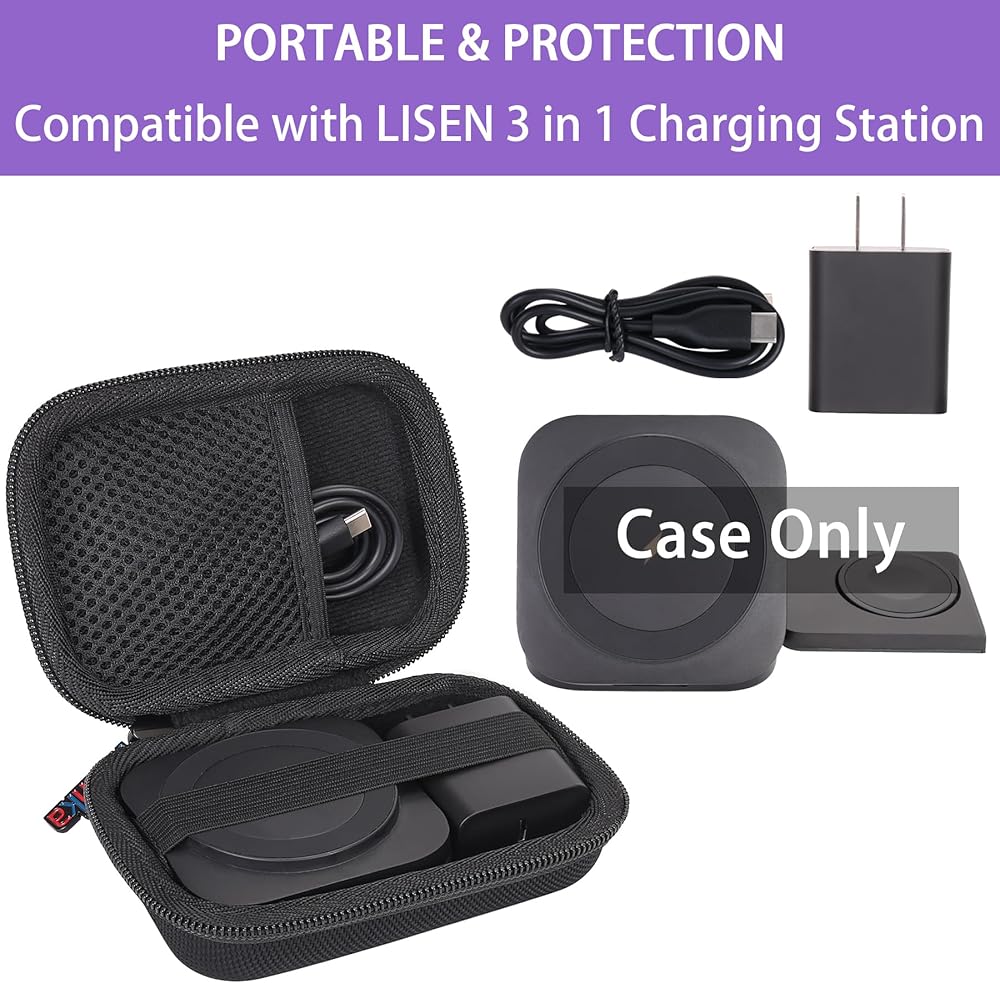 • تصميم أنيق، جراب مصمم لشاحن LISEN 3 في 1، يناسب تمامًا. الغلاف الصلب لشاحن LISEN المتطور 3 في 1 باللون الأسود. يمكنك وضع محطة الشحن LISEN 3 in 1 magsafe في حقيبة صلبة مصممة خصيصًا لشاحن السفر LISEN magsafe لسهولة الحمل عند الخروج.