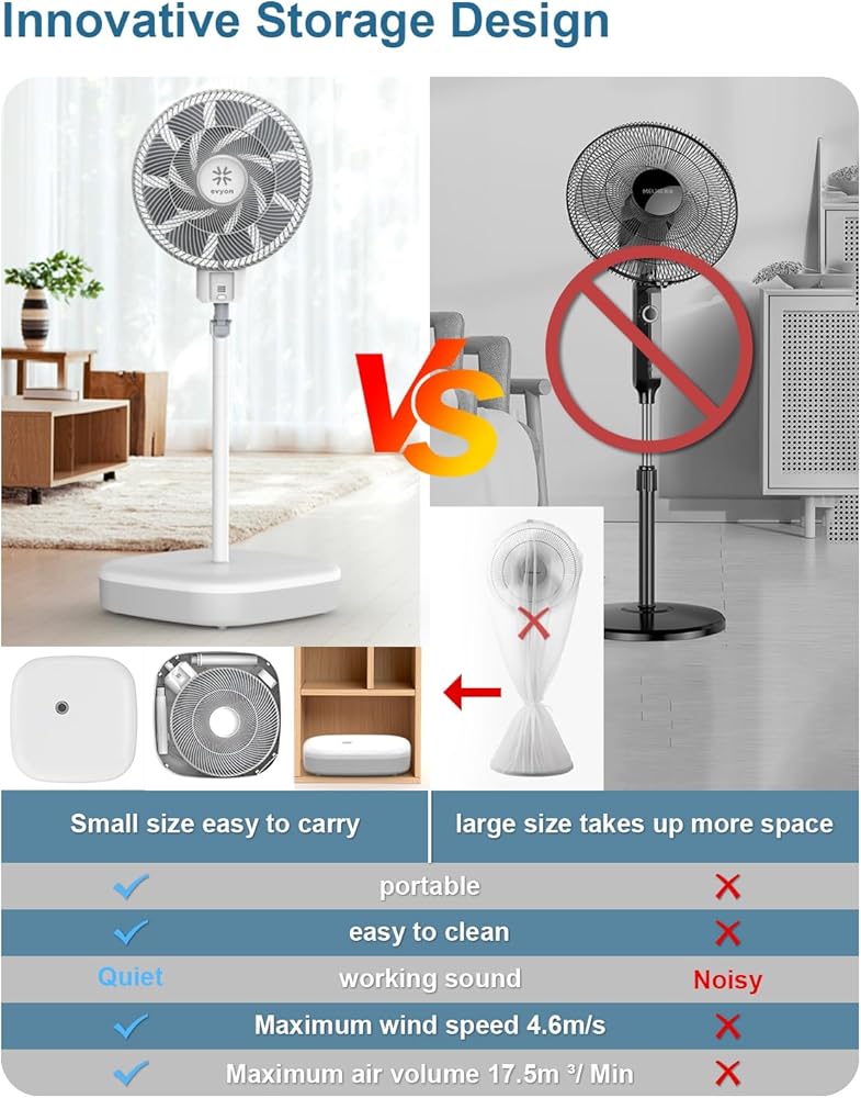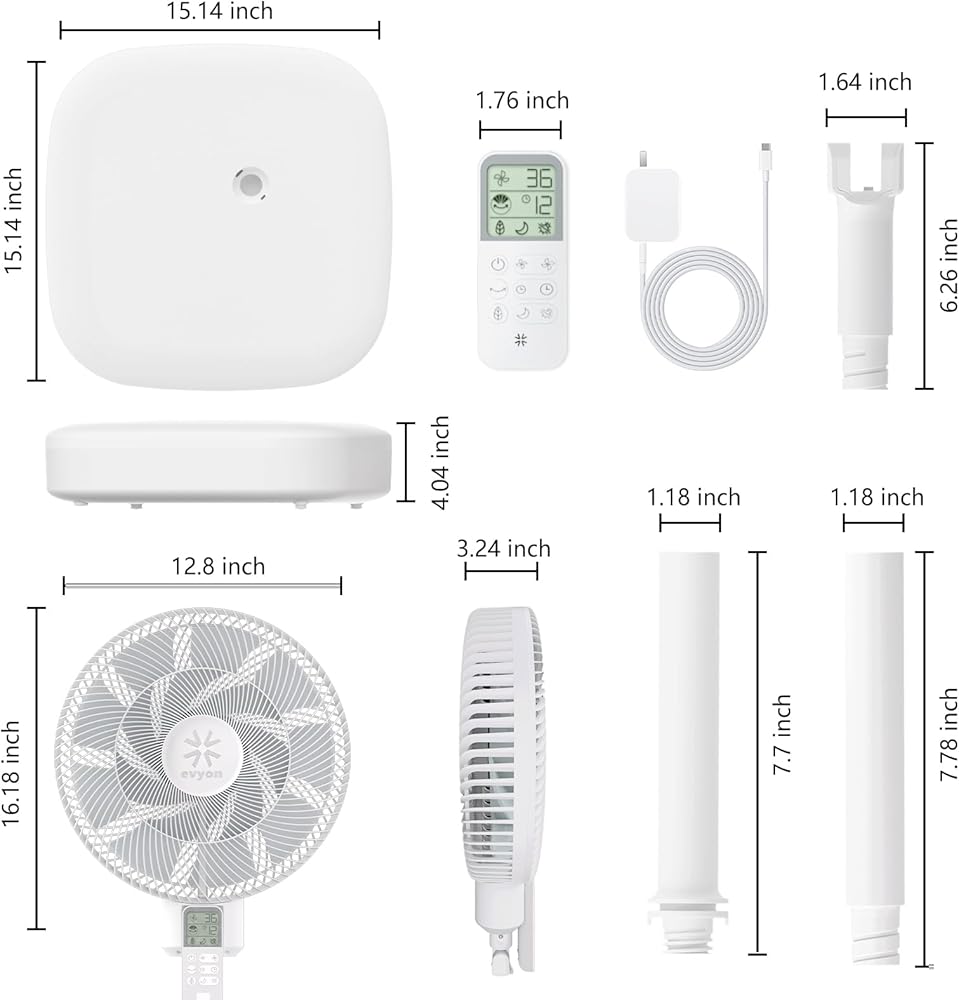 Foldable & Storage Case Unique Design Evyon pedestal fan equipped with a unique storage box, allowing you to easily disassemble and store the fan components within minutes. The standing fan can be folded up completely and the foldable storage size 17.8 "X3.82". The height of the installed fan is 37.8 "(measured from the bottom of the fan), and the diameter of the fan circle is 12.8". It can also protect the stand up fan from dust in autumn and winter, easy to organize and store.